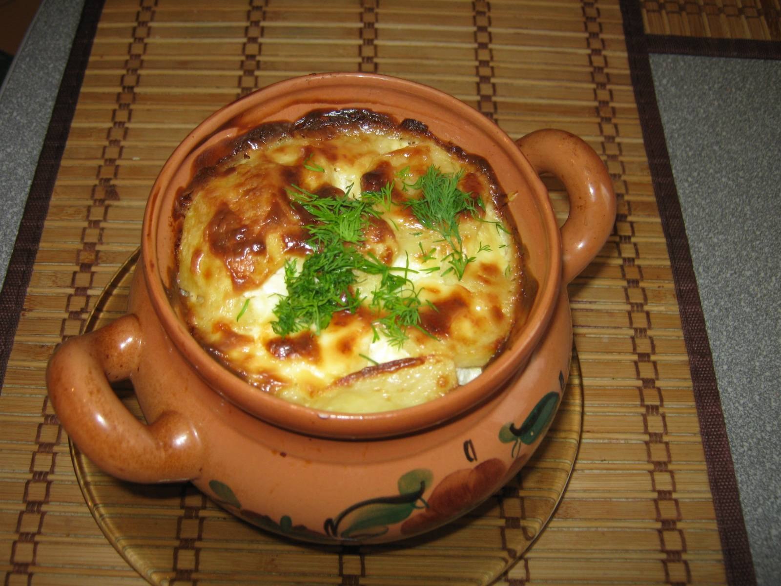Картошка с курицей и грибами в горшочках