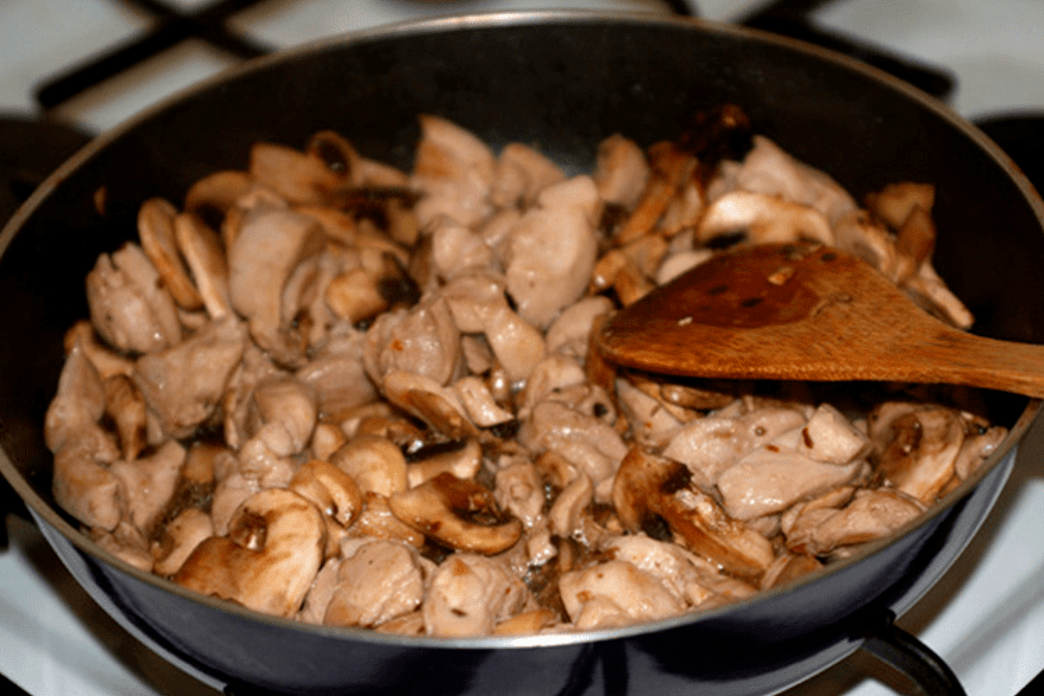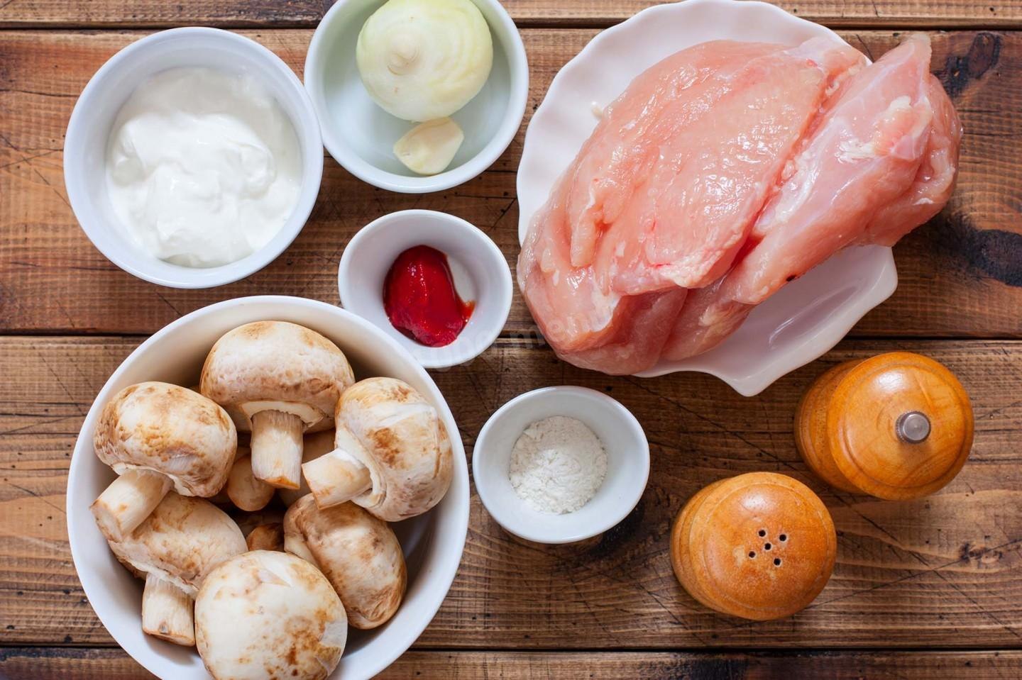 Куриное филе с грибами в сметанном соусе на сковороде