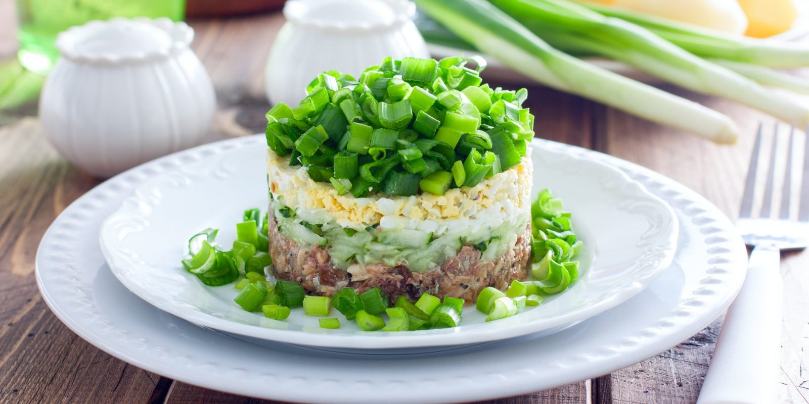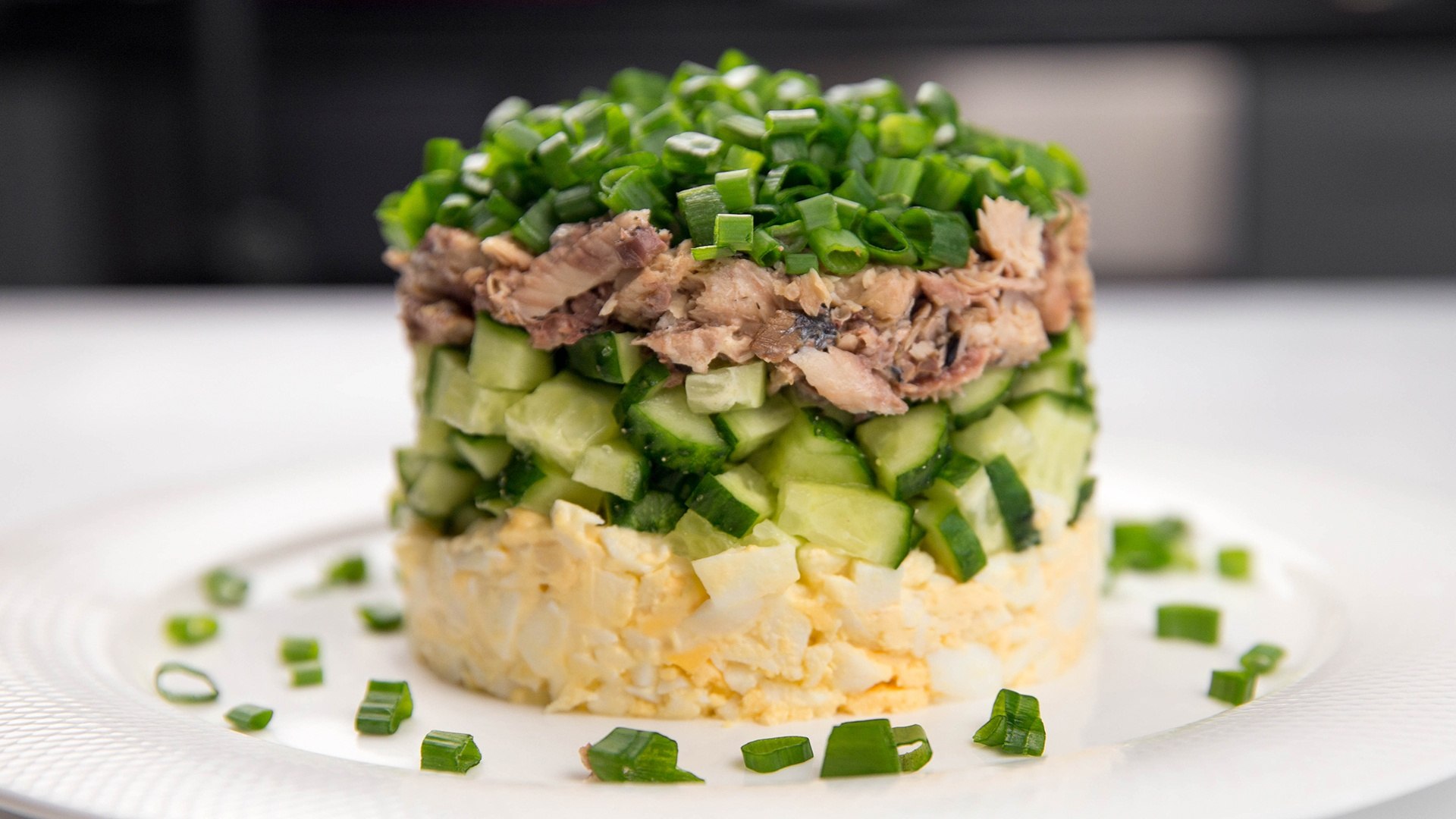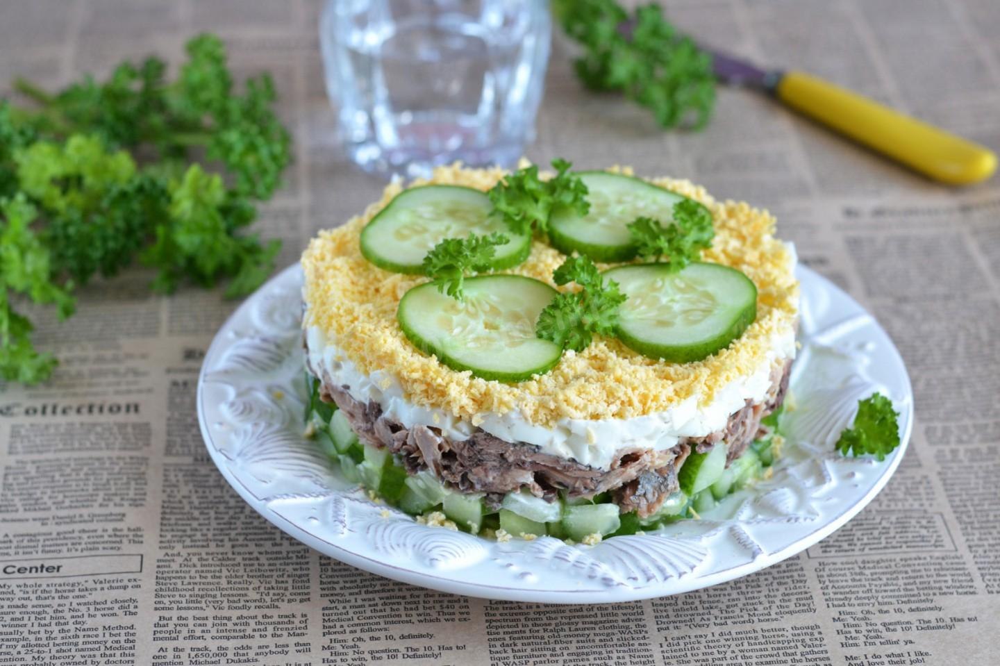 Салат с рыбными консервами, огурцом, яйцом и зелёным луком