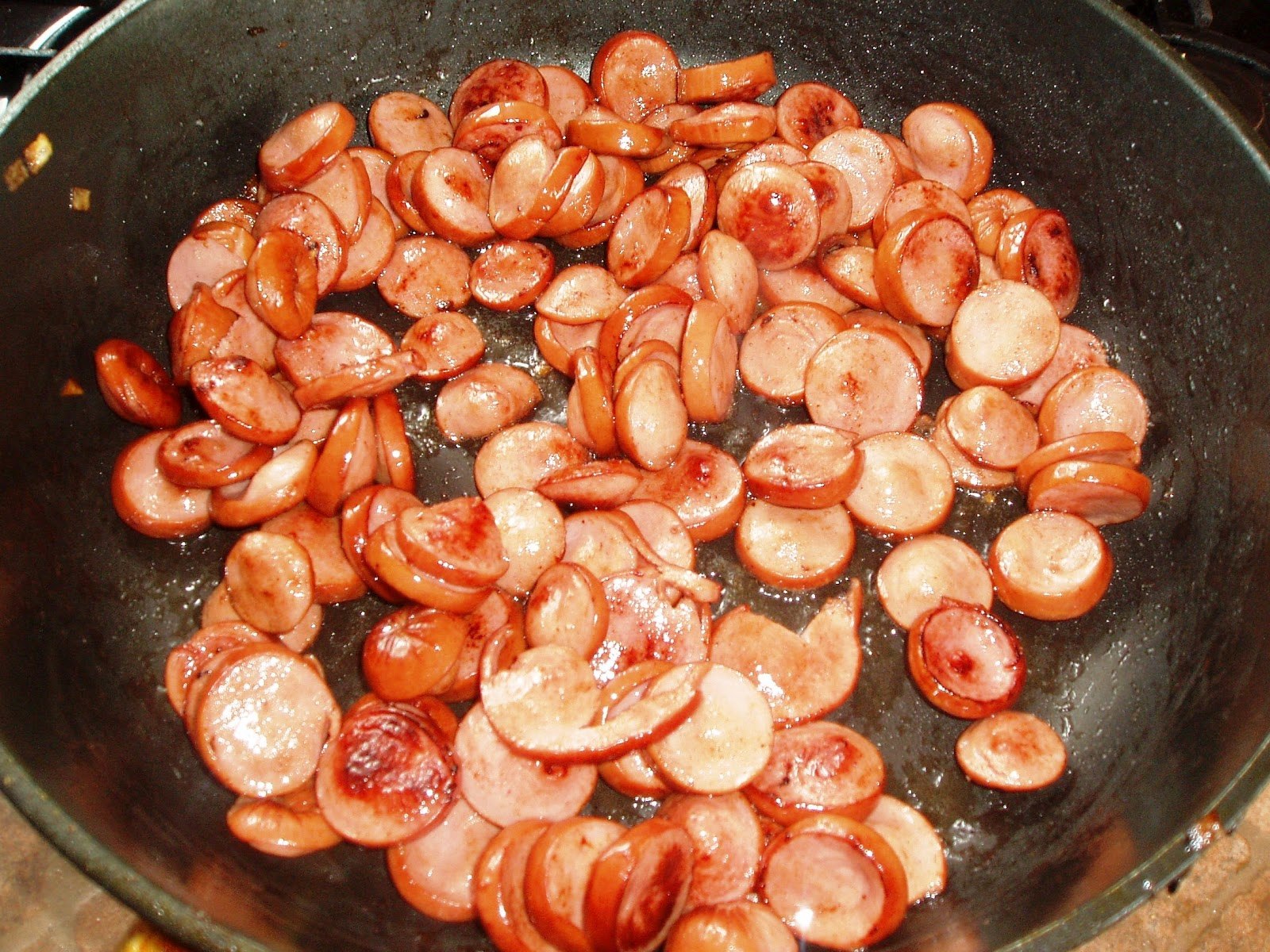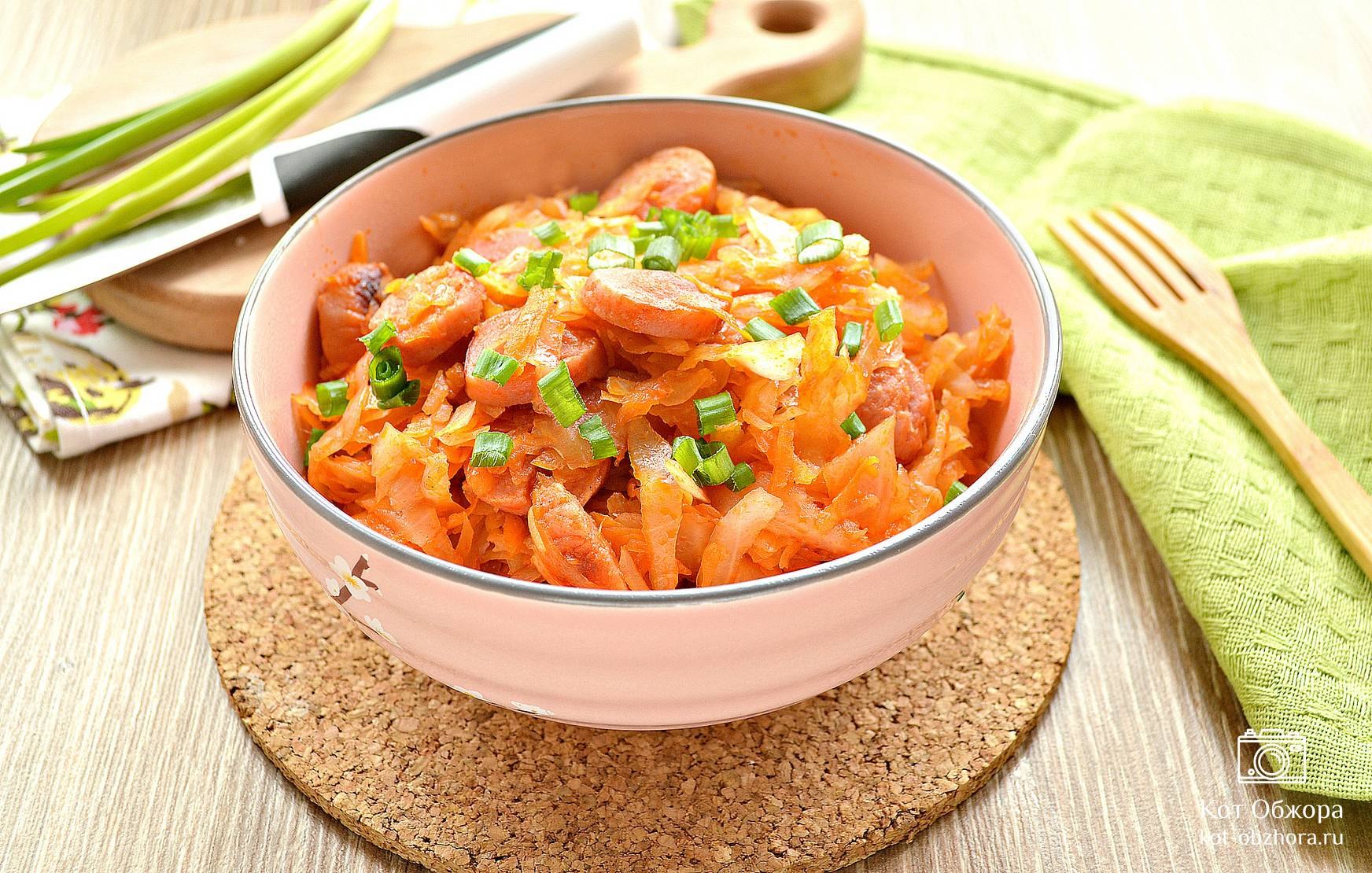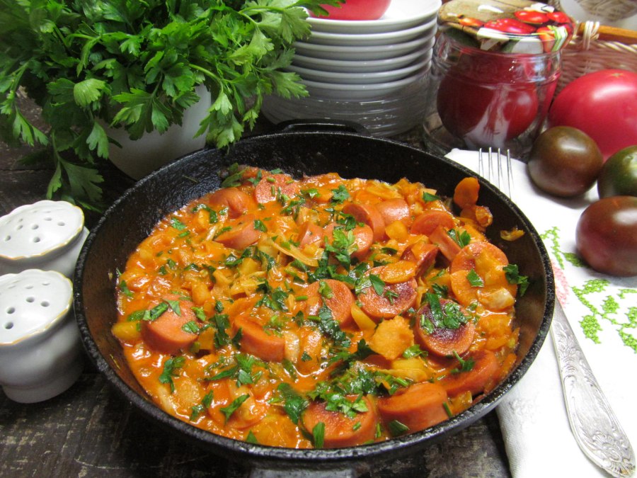 Капуста с сосисками на сковороде