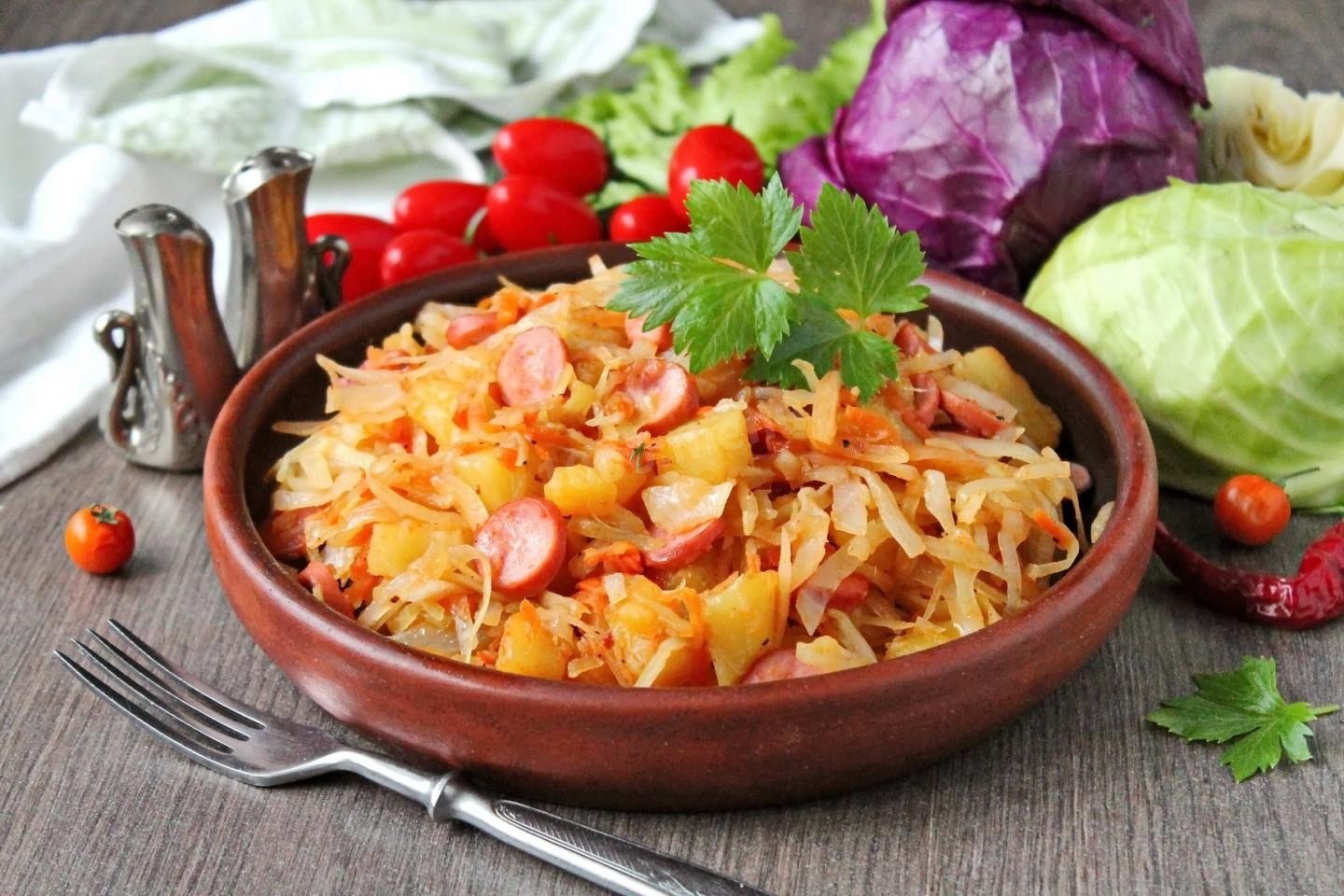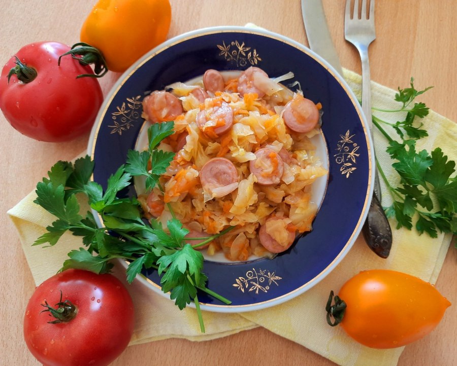 Тушеная капуста с сардельками