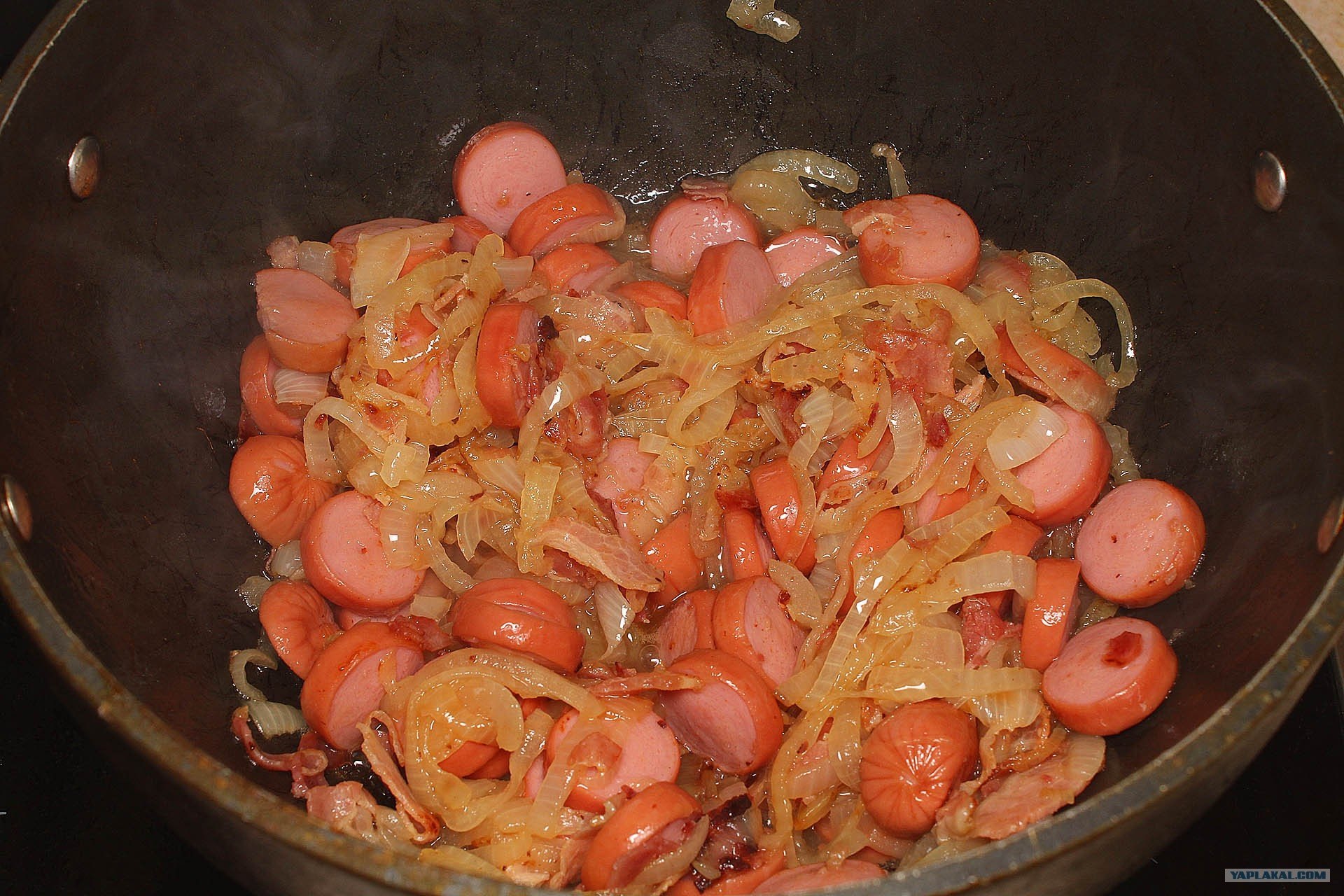 Солянка на сковороде с сосисками