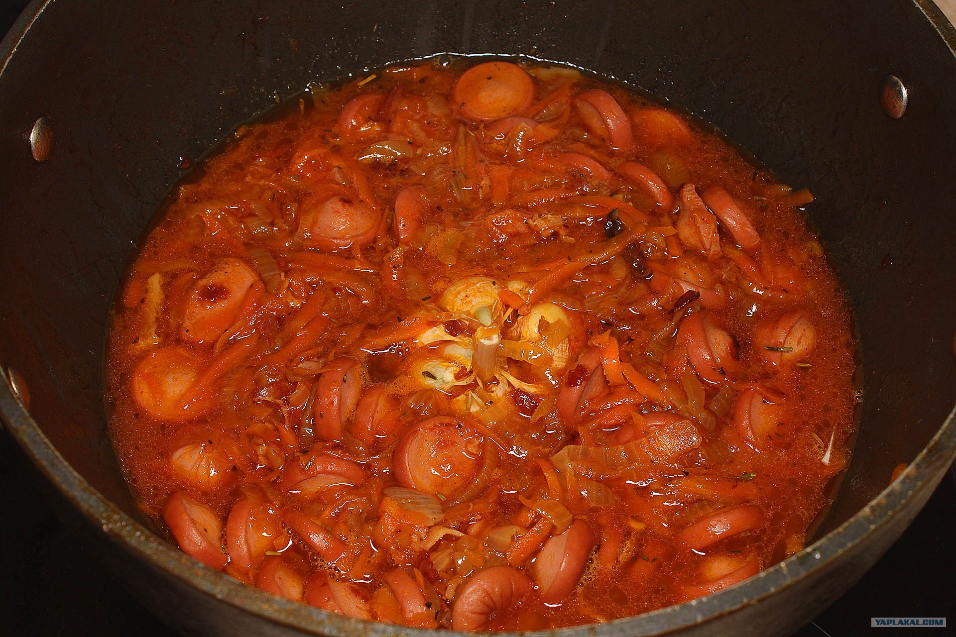 Солянка в кастрюле с сосисками