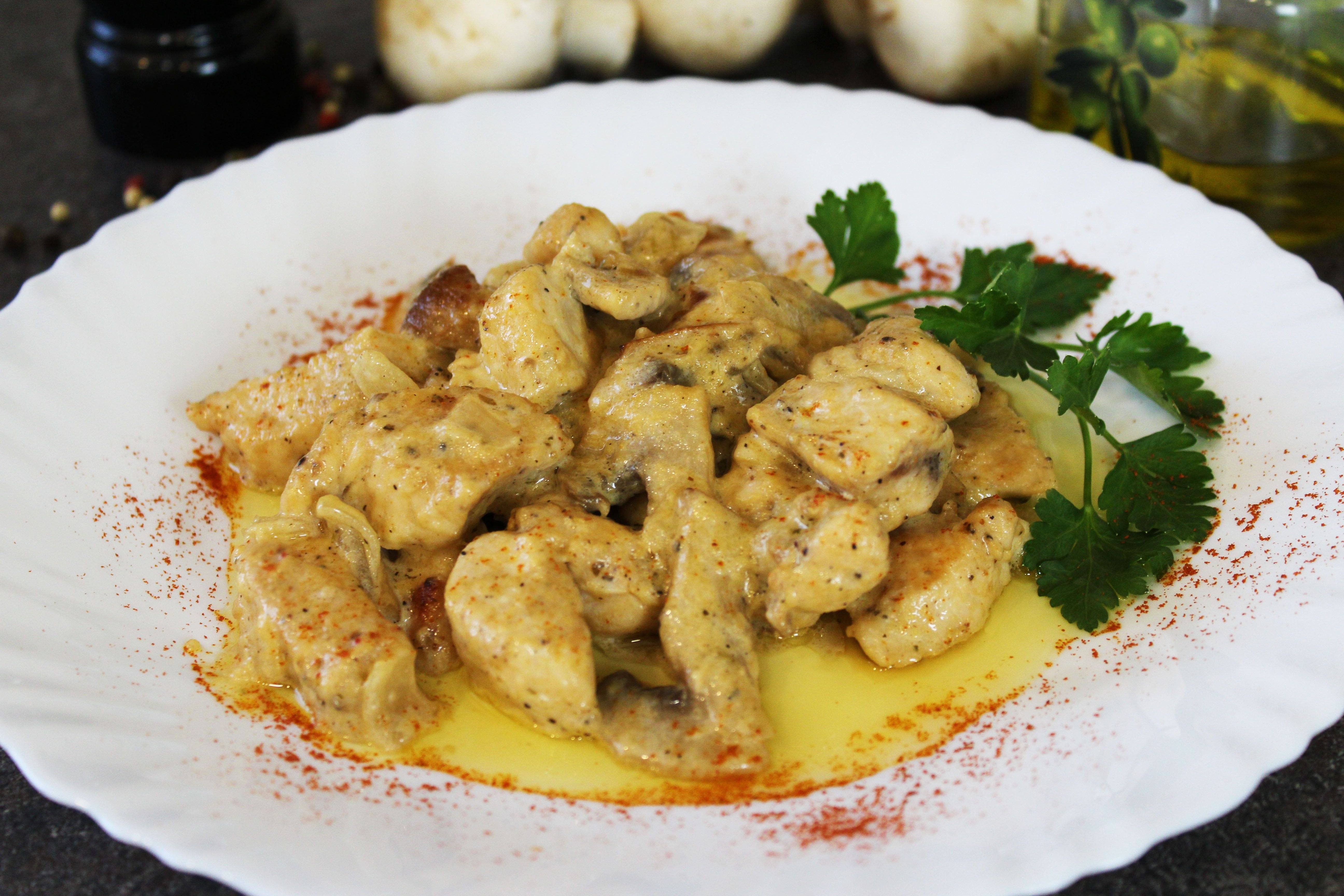 Кцрица с шампиньонамив сливочном соусе