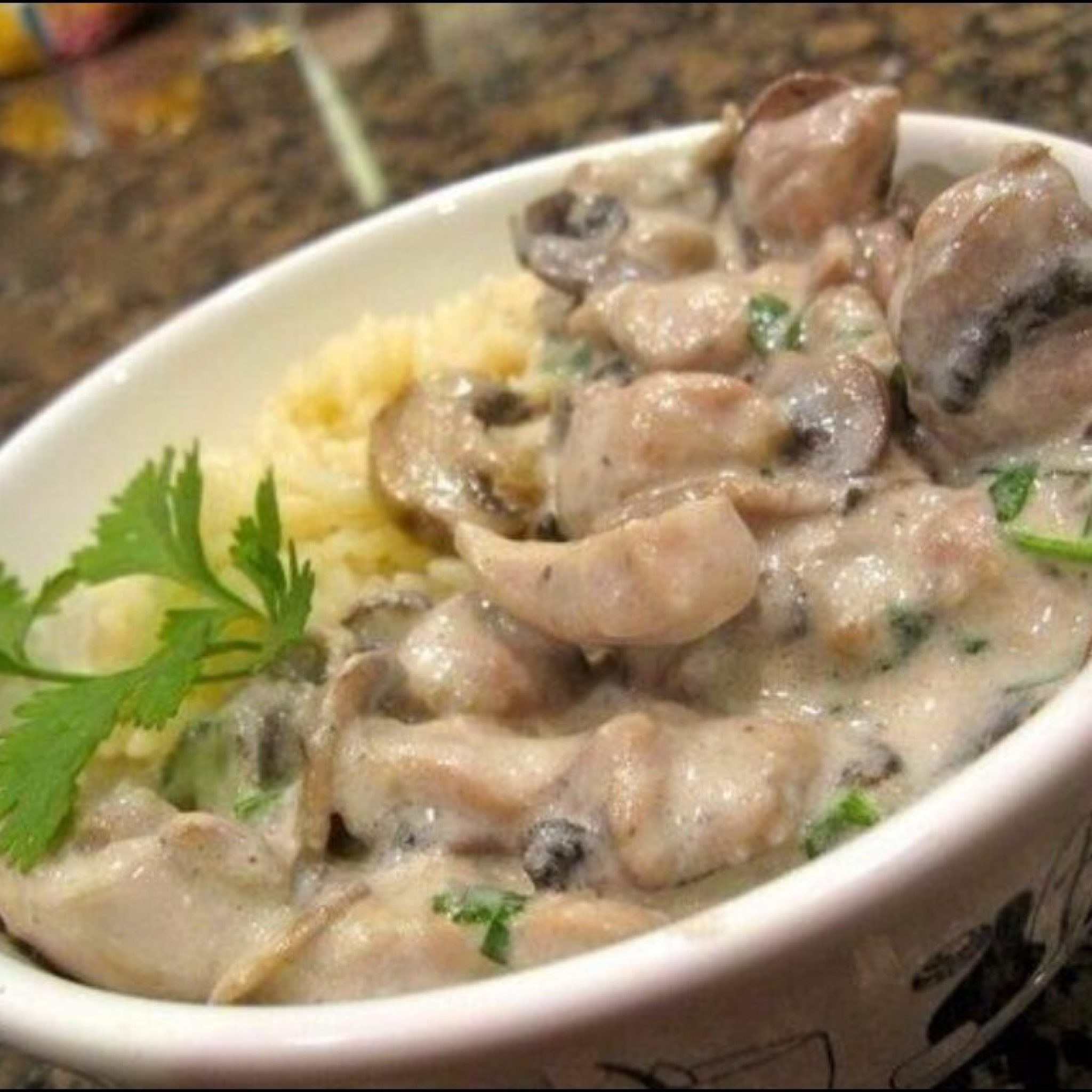 Птица под паровым соусом с грибами и рисом