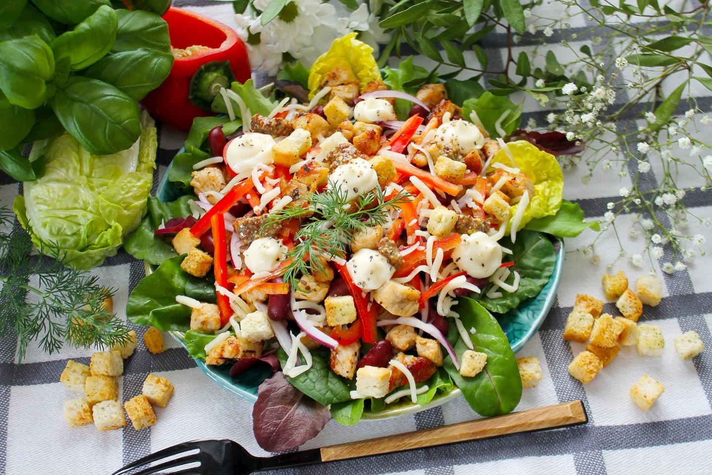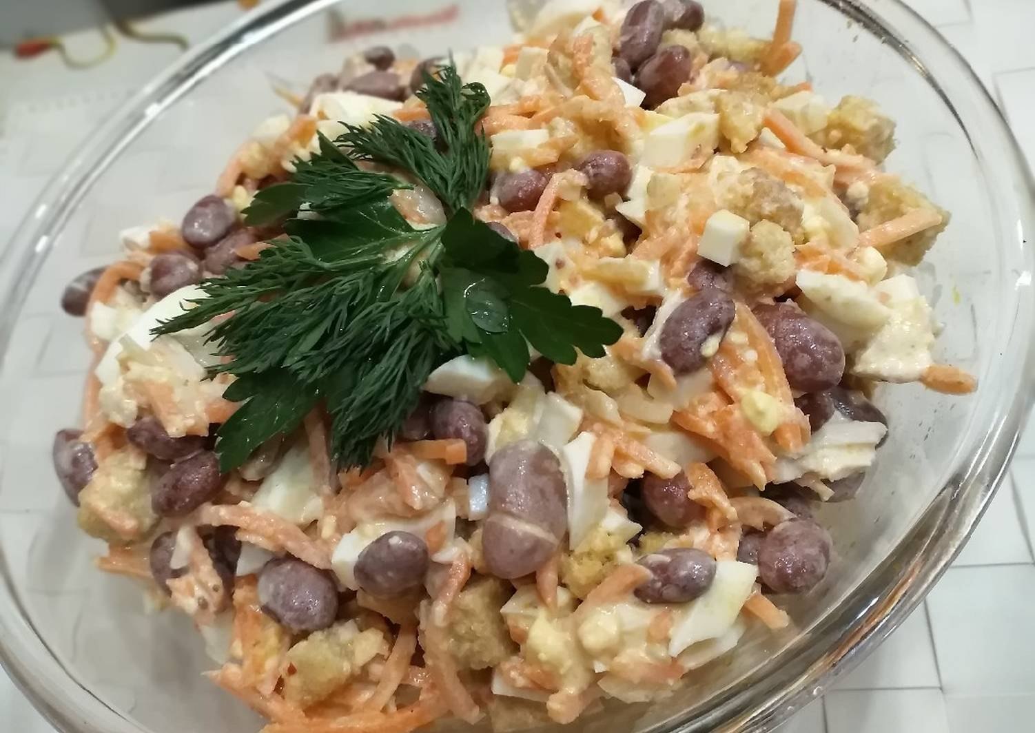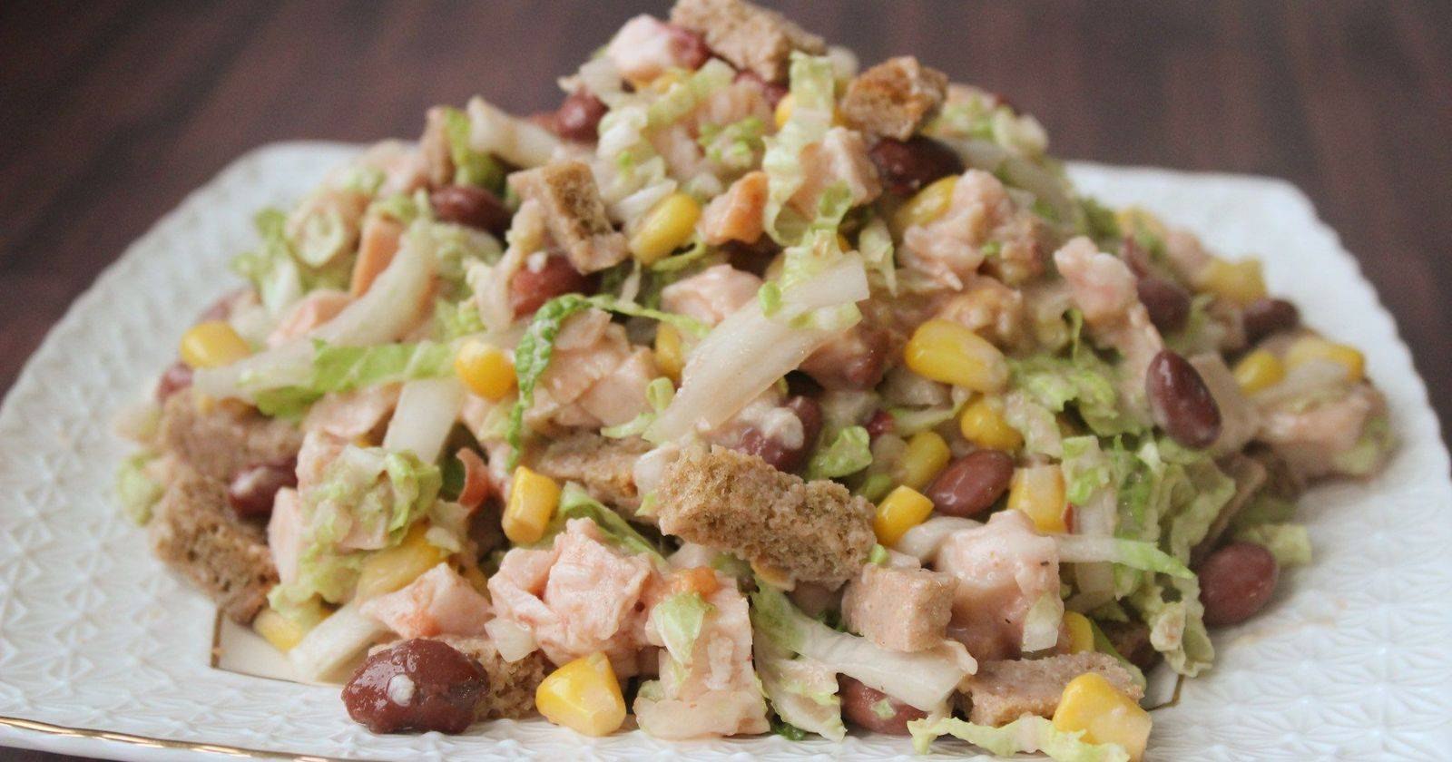 Салат с фасолью и сухариками и колбасой и кукурузой
