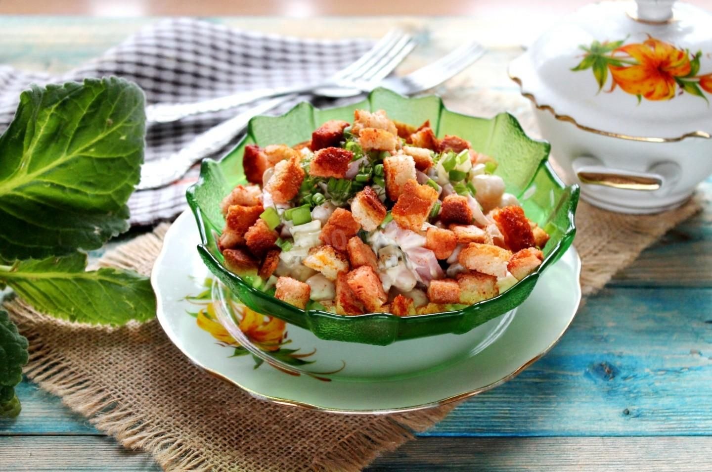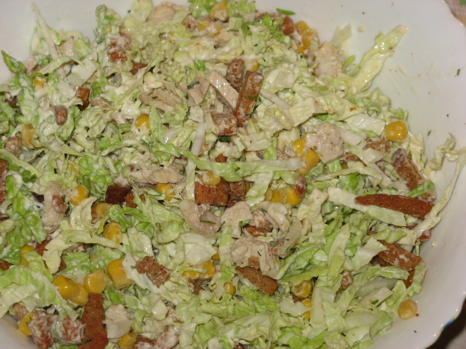 Салат с пекинской капустой и куриной грудкой и сухариками