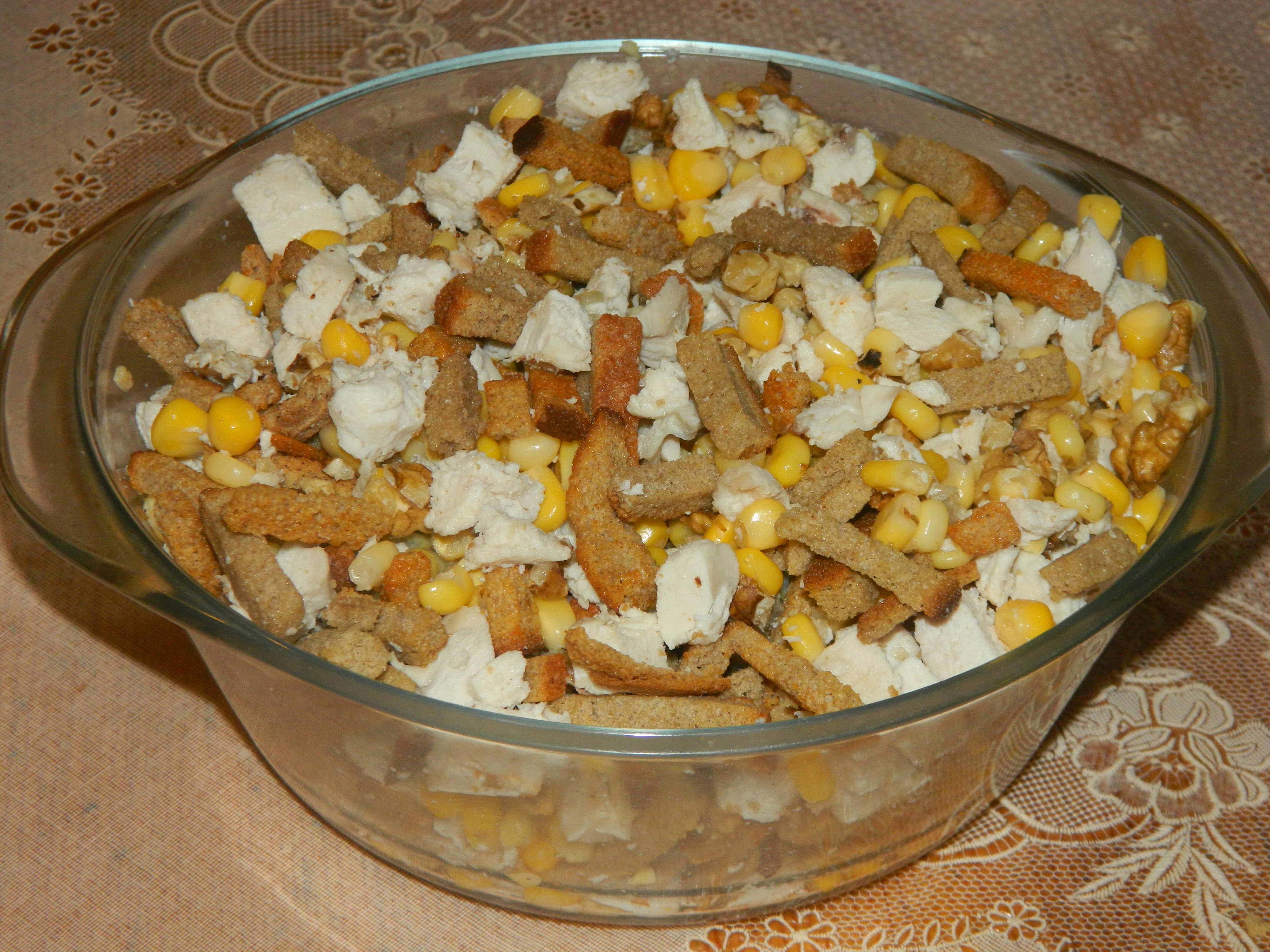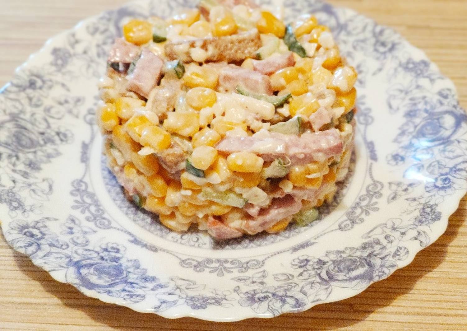 Салат с сухариками и кукурузой и колбасой и огурцом