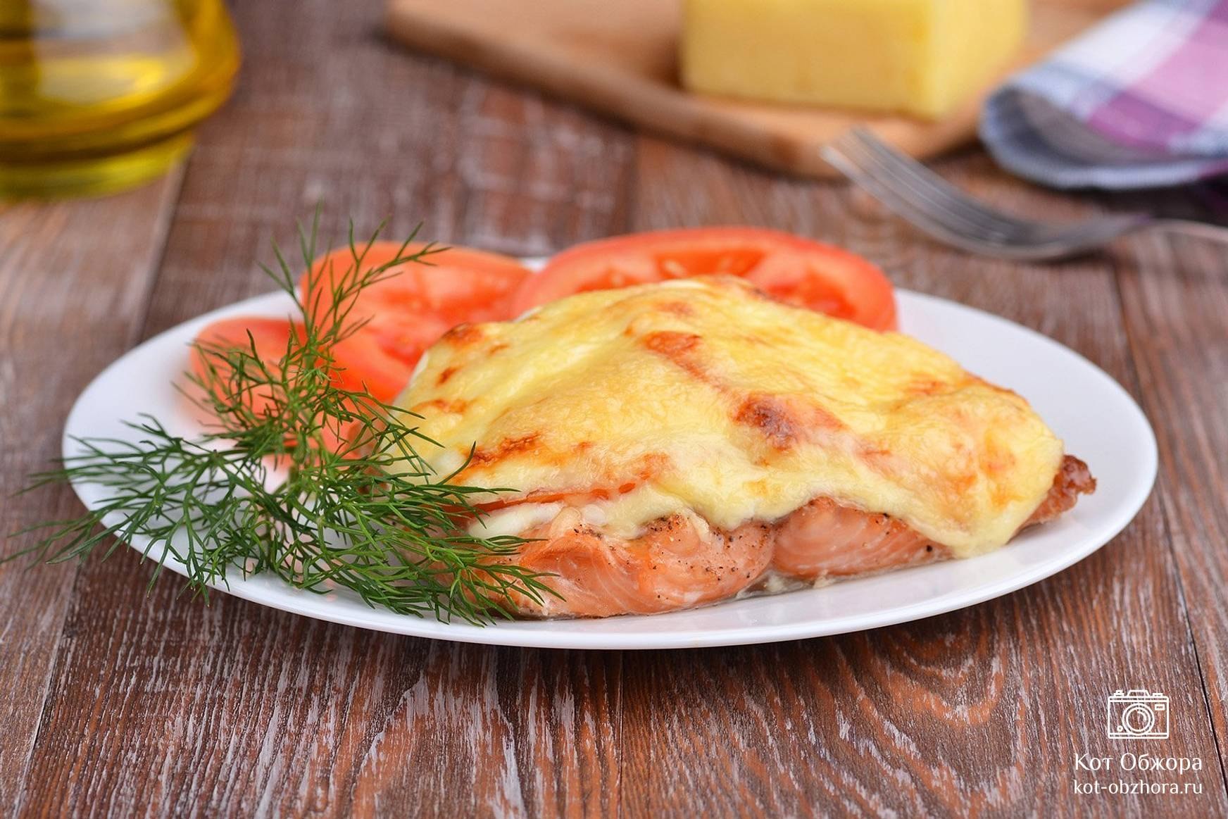 Горбуша под сыром с помидорами и майонезом