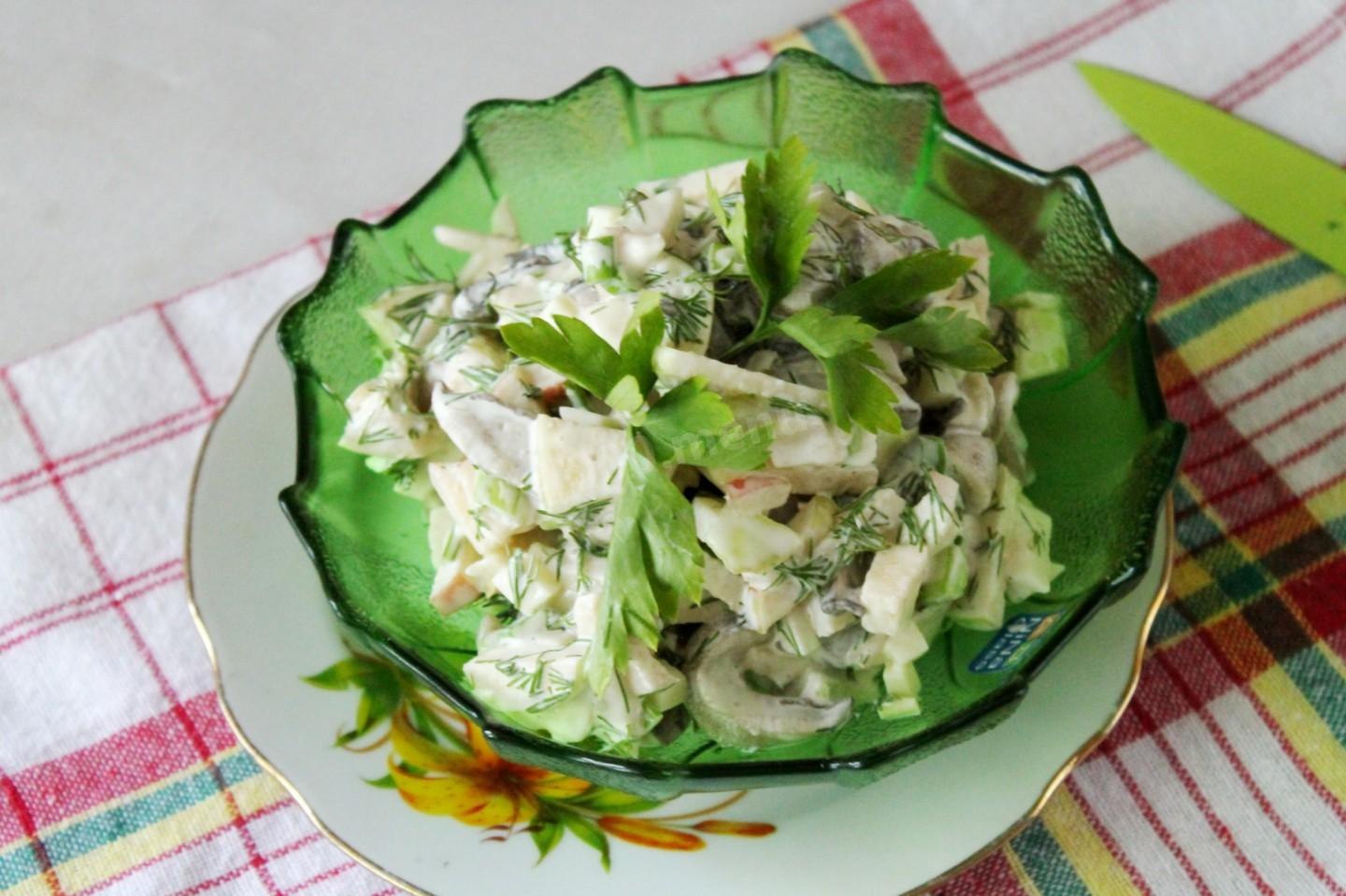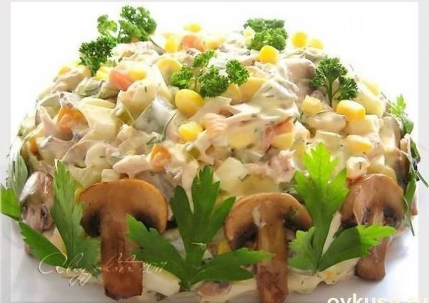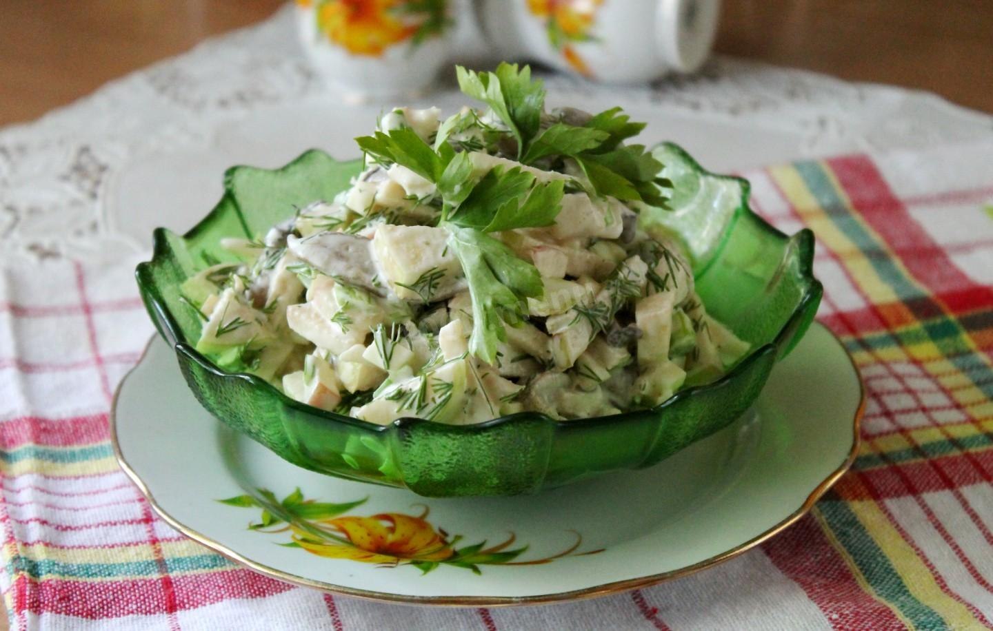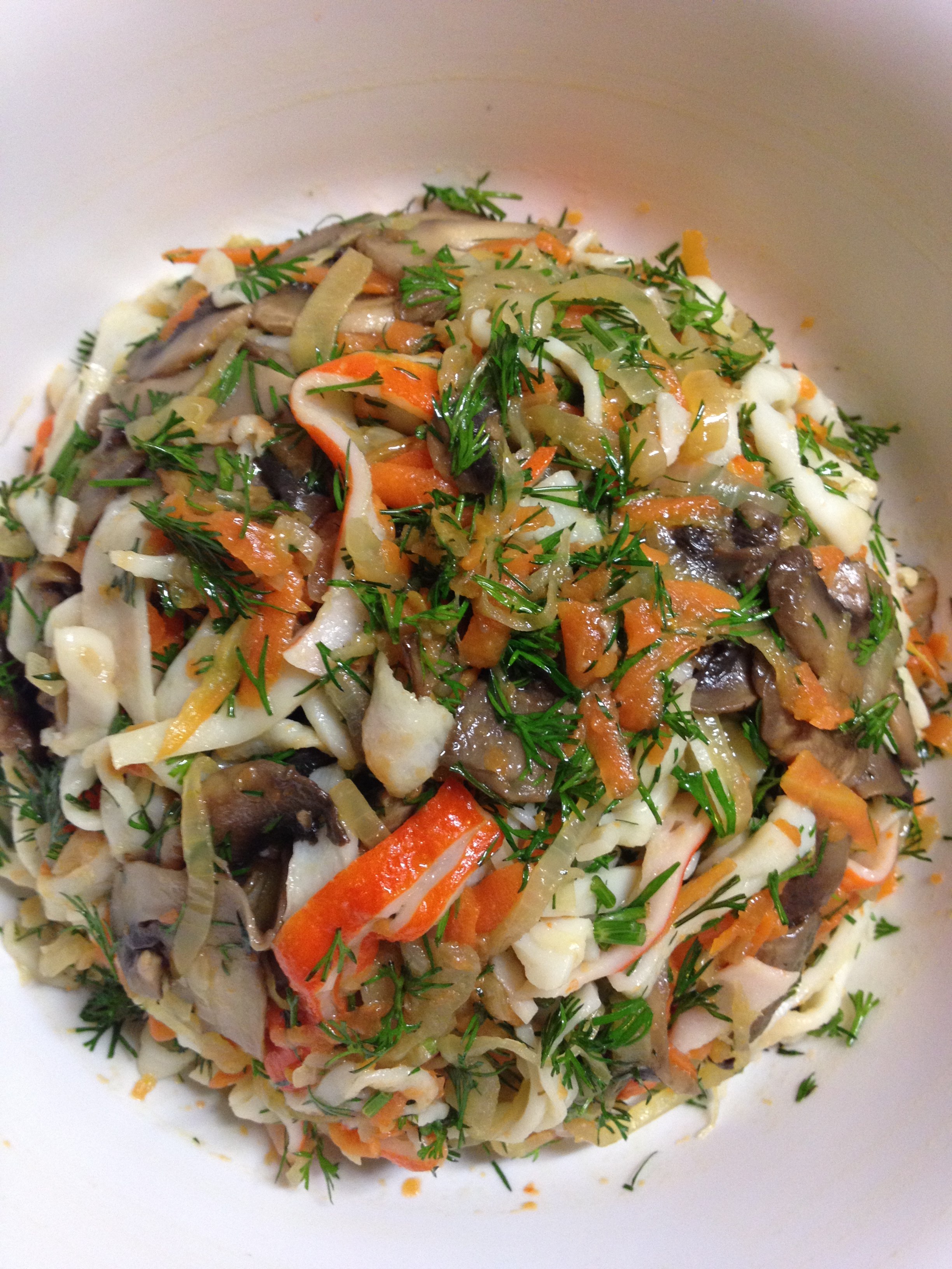 Салат с обжаренными крабовыми палочками шампиньонами и луком