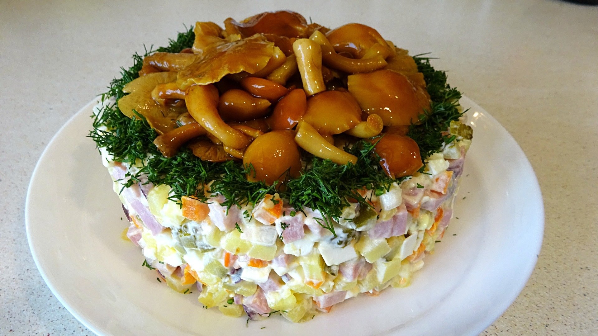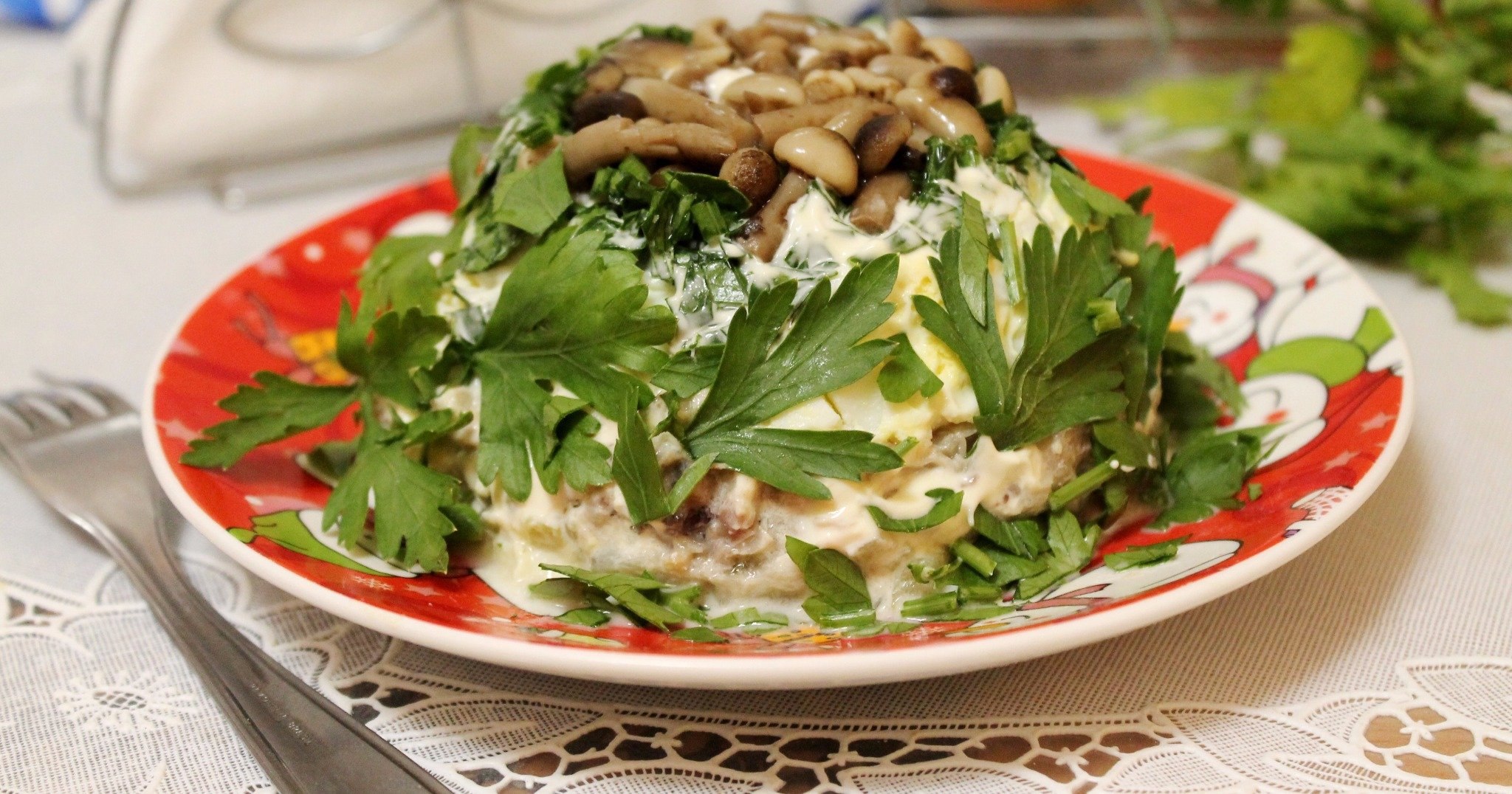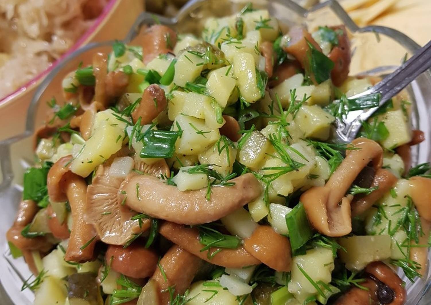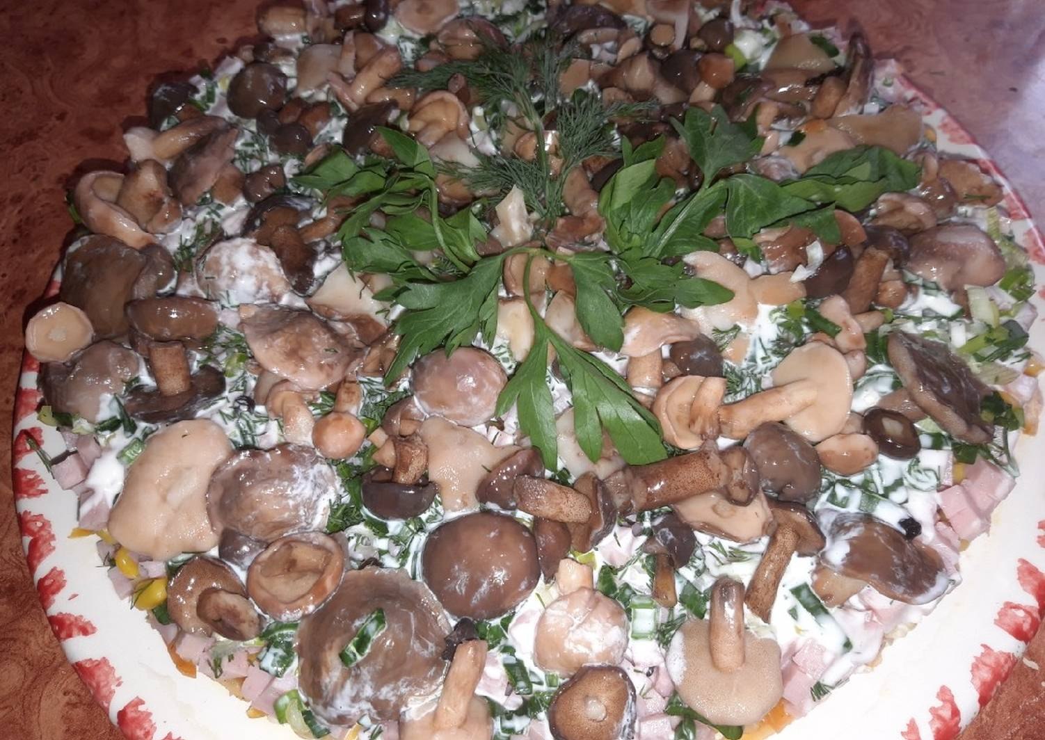 Салат с обжаренными крабовыми палочками шампиньонами и луком