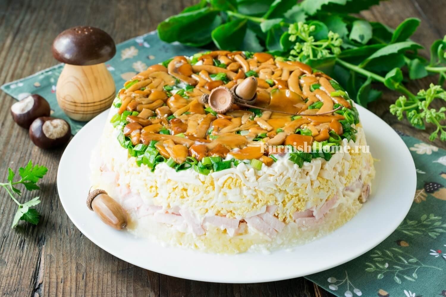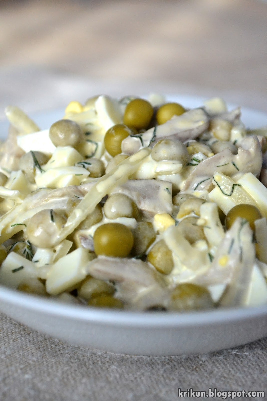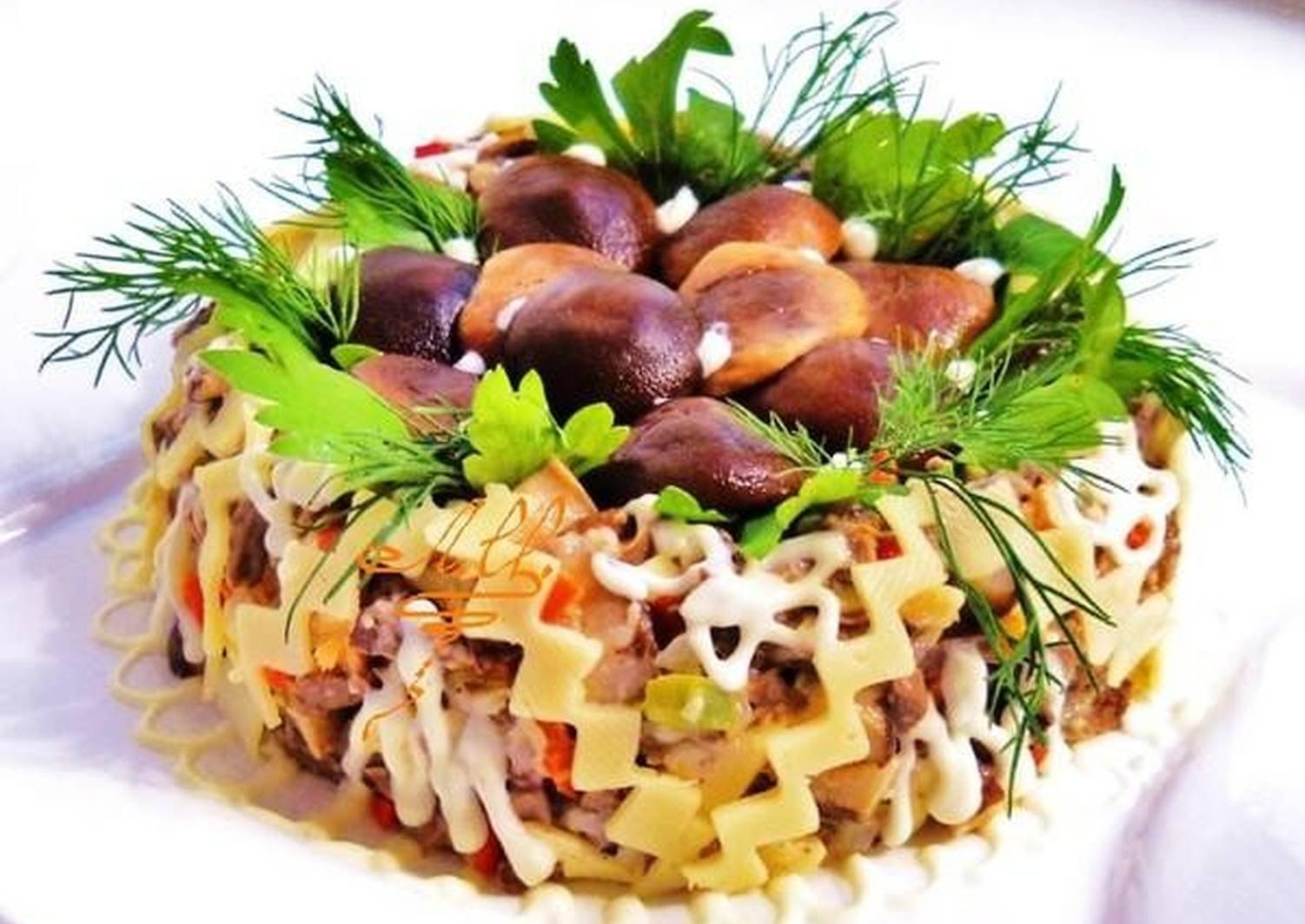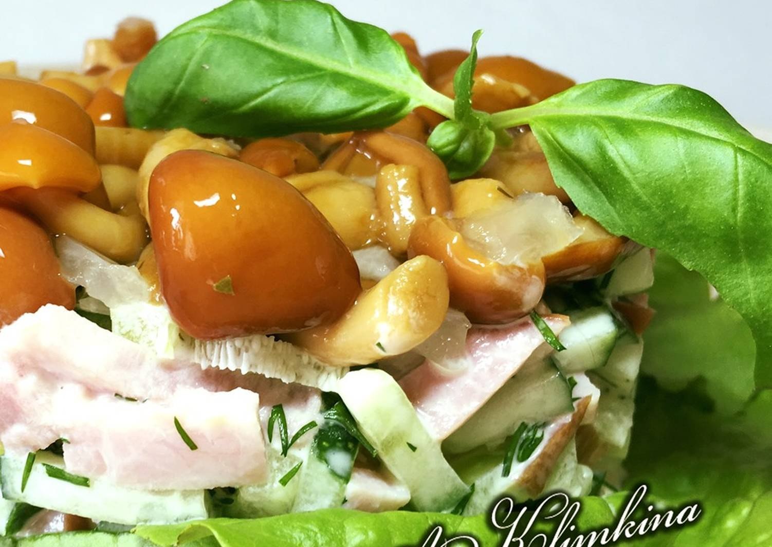 Салат с обжаренными крабовыми палочками шампиньонами и луком