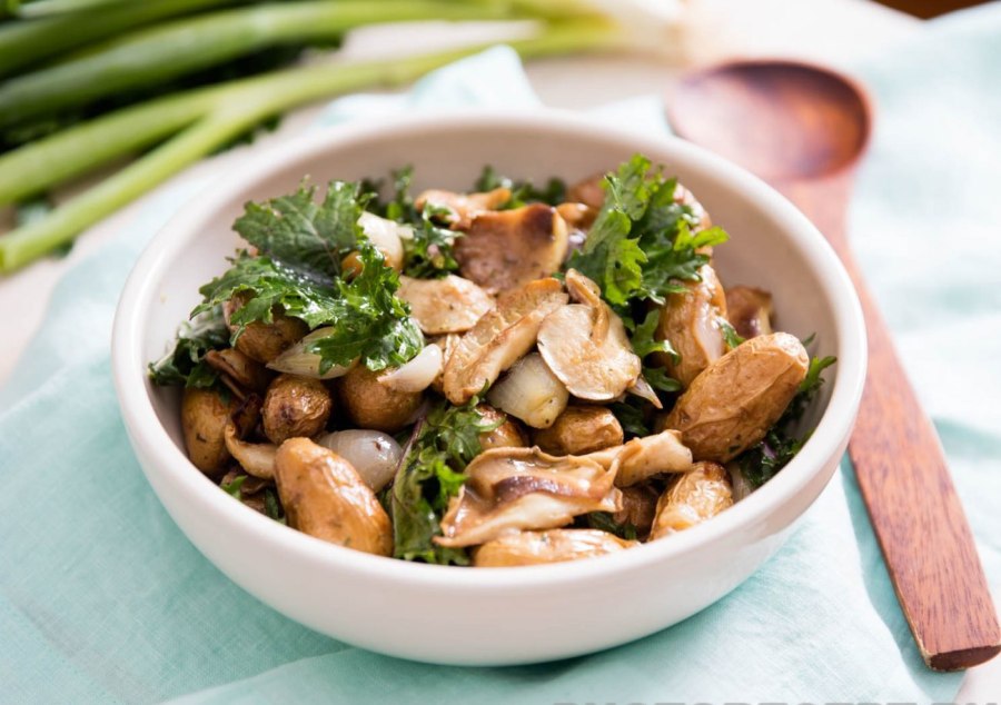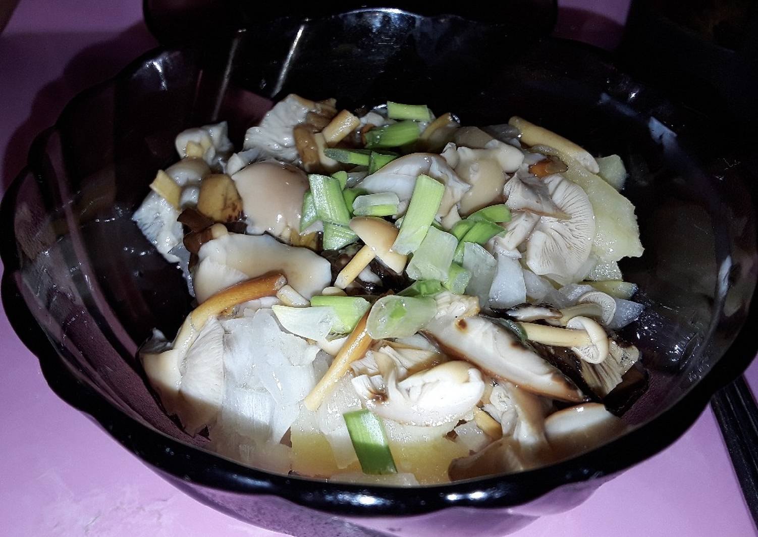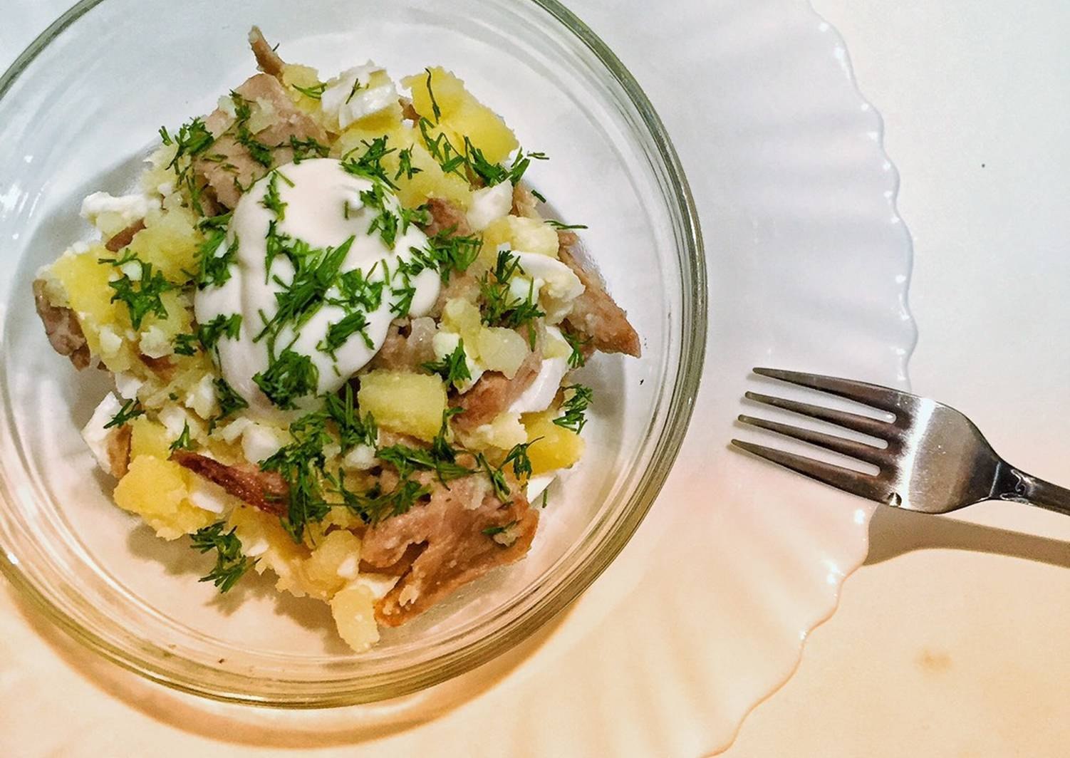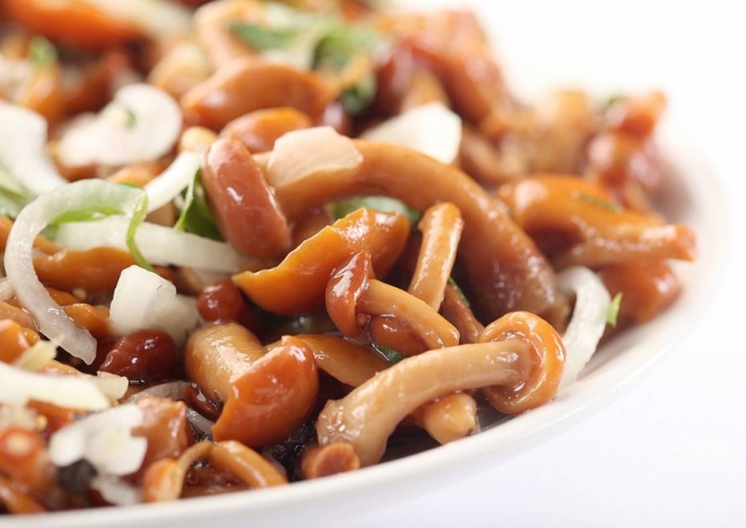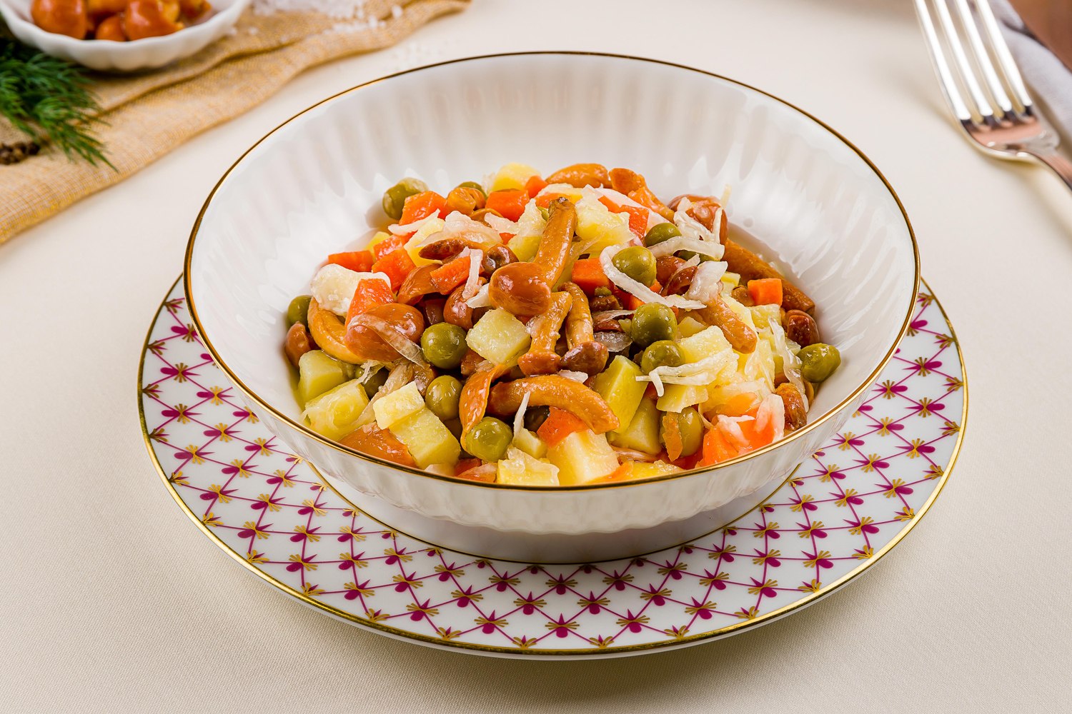 Салат с обжаренными крабовыми палочками шампиньонами и луком
