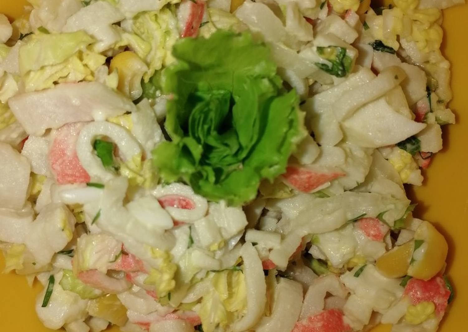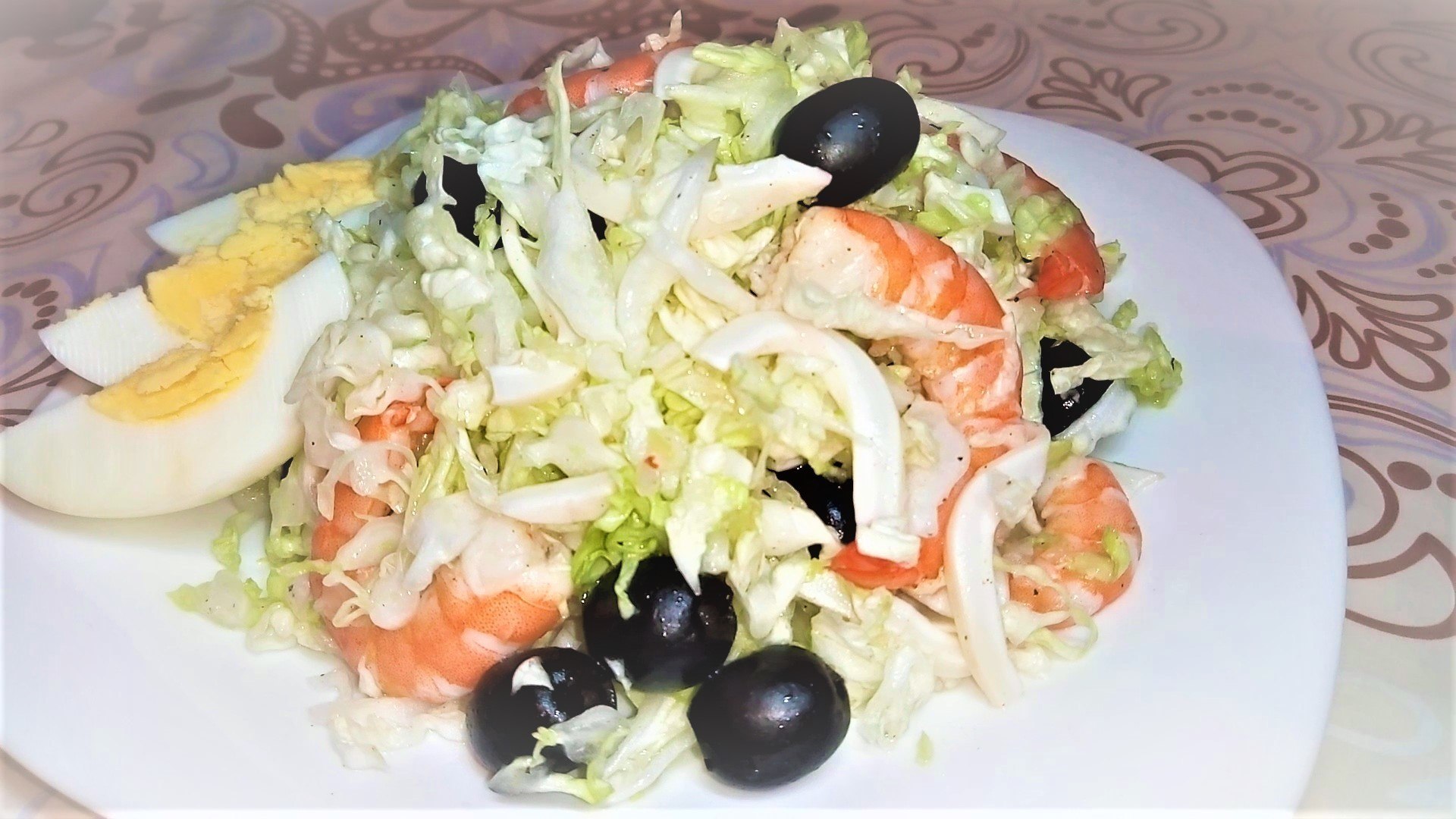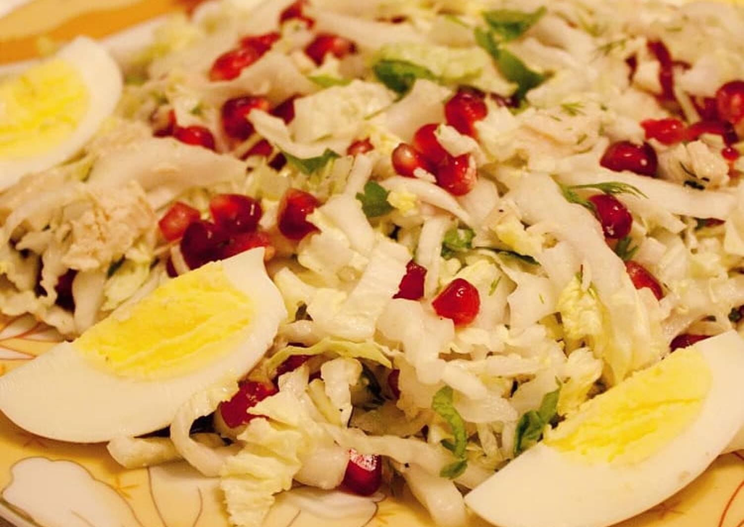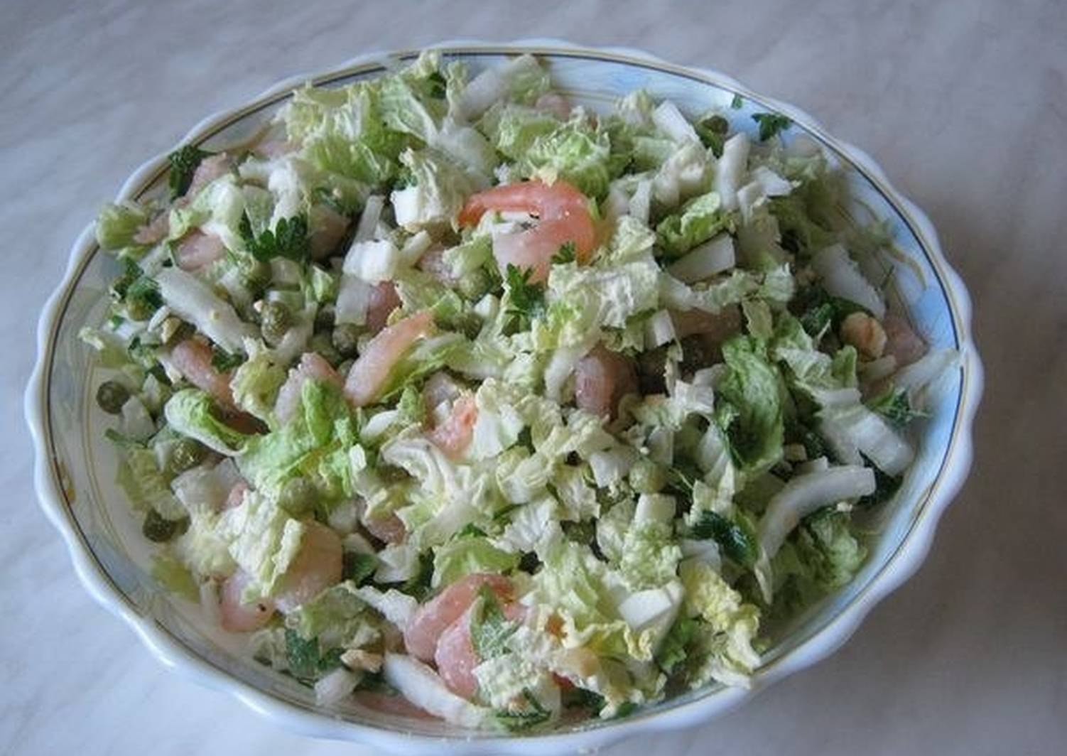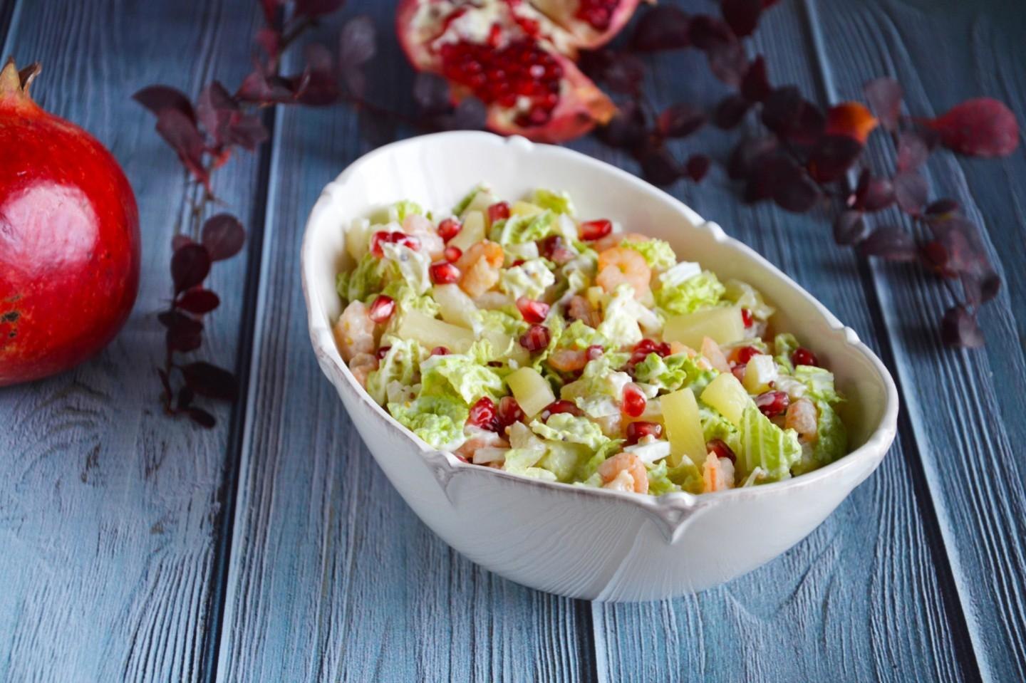 Салат из пекинской капусты с креветками гранатом, ананасом