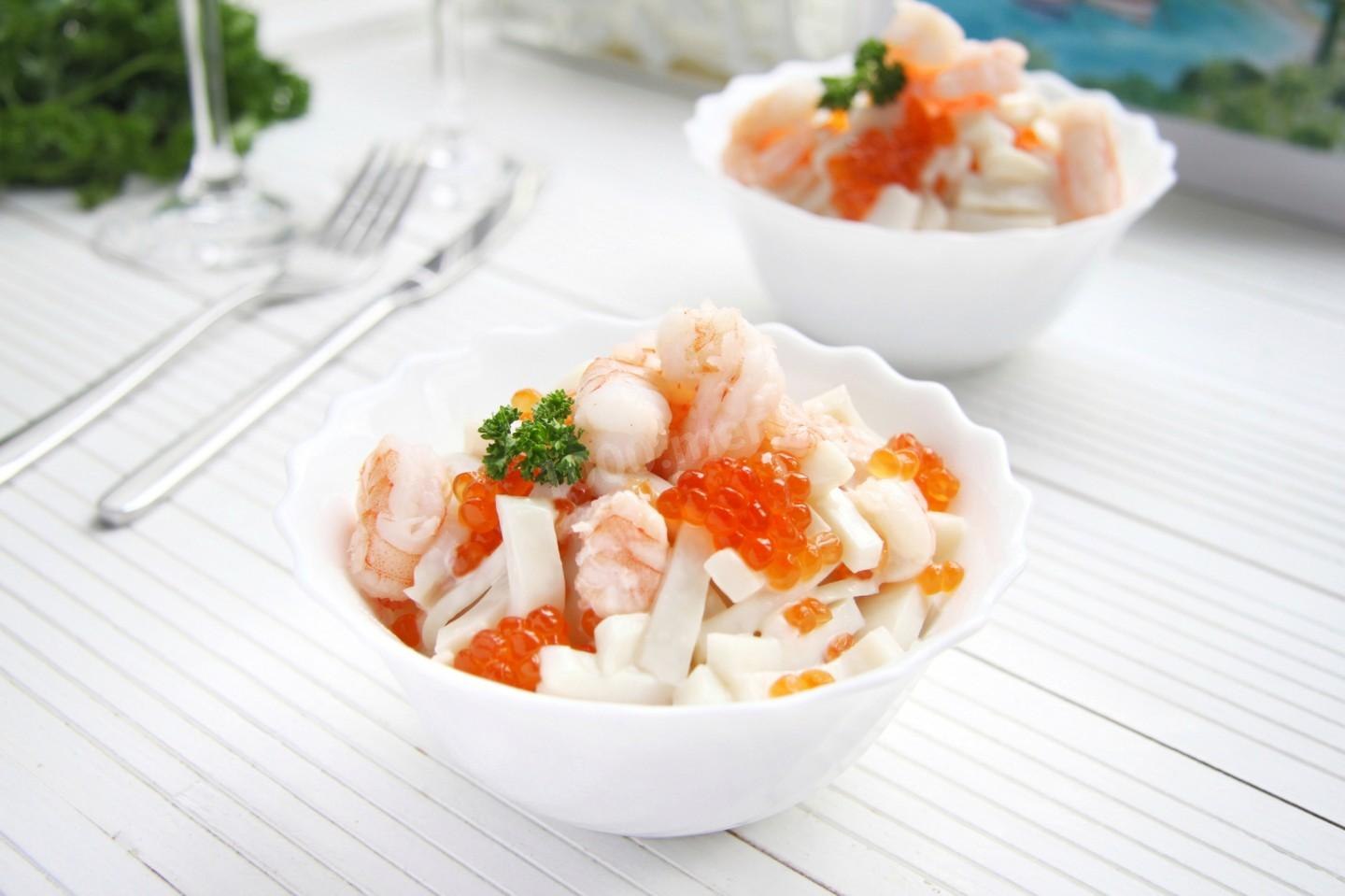 Кальмаровый салат с красной икрой