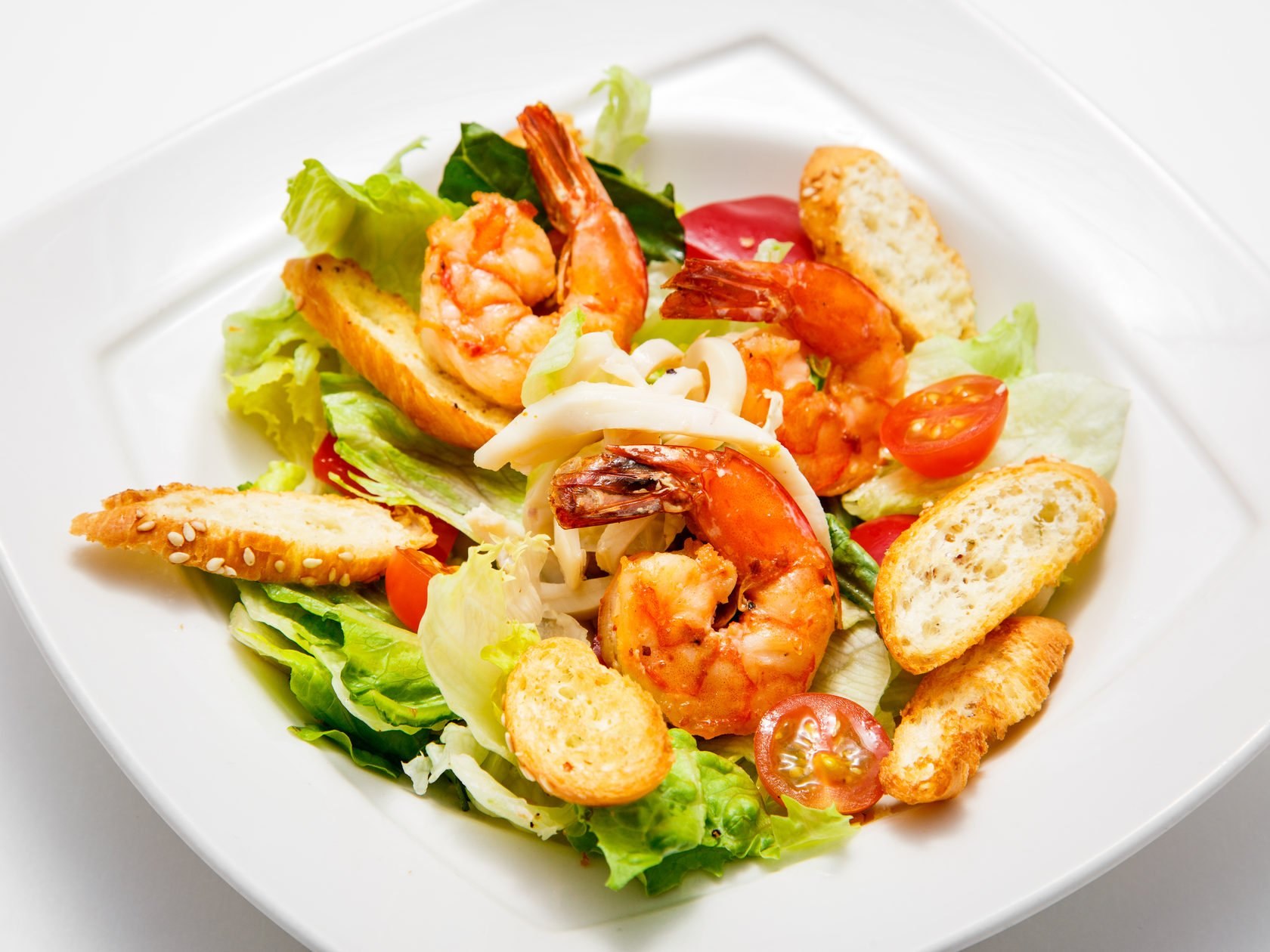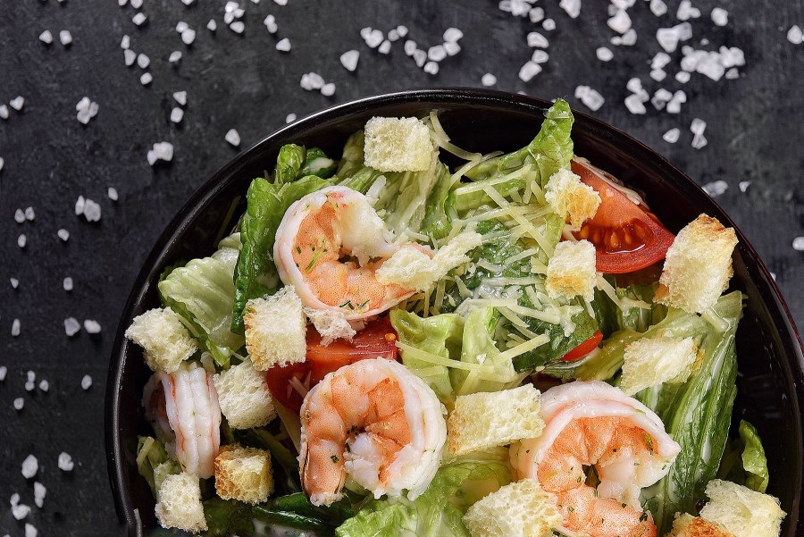 Салат с креветками и сухариками