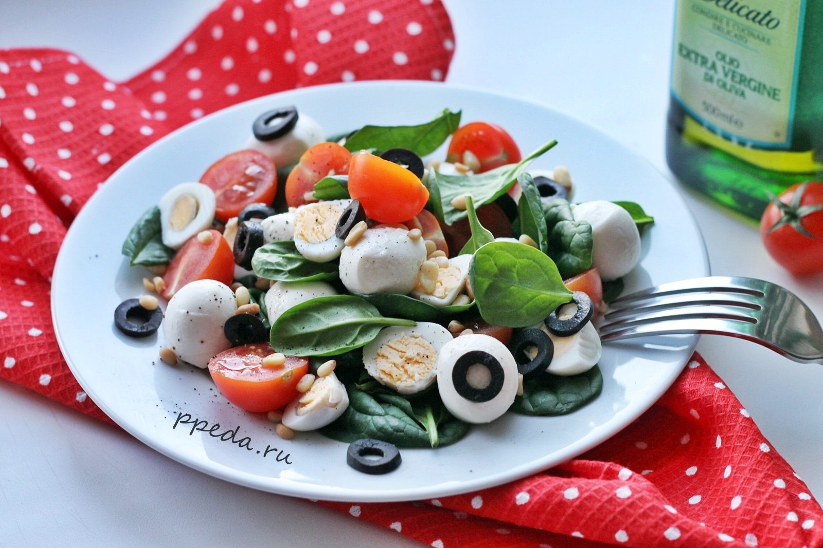 Салат с перепелиными яйцами моцареллой помидорами