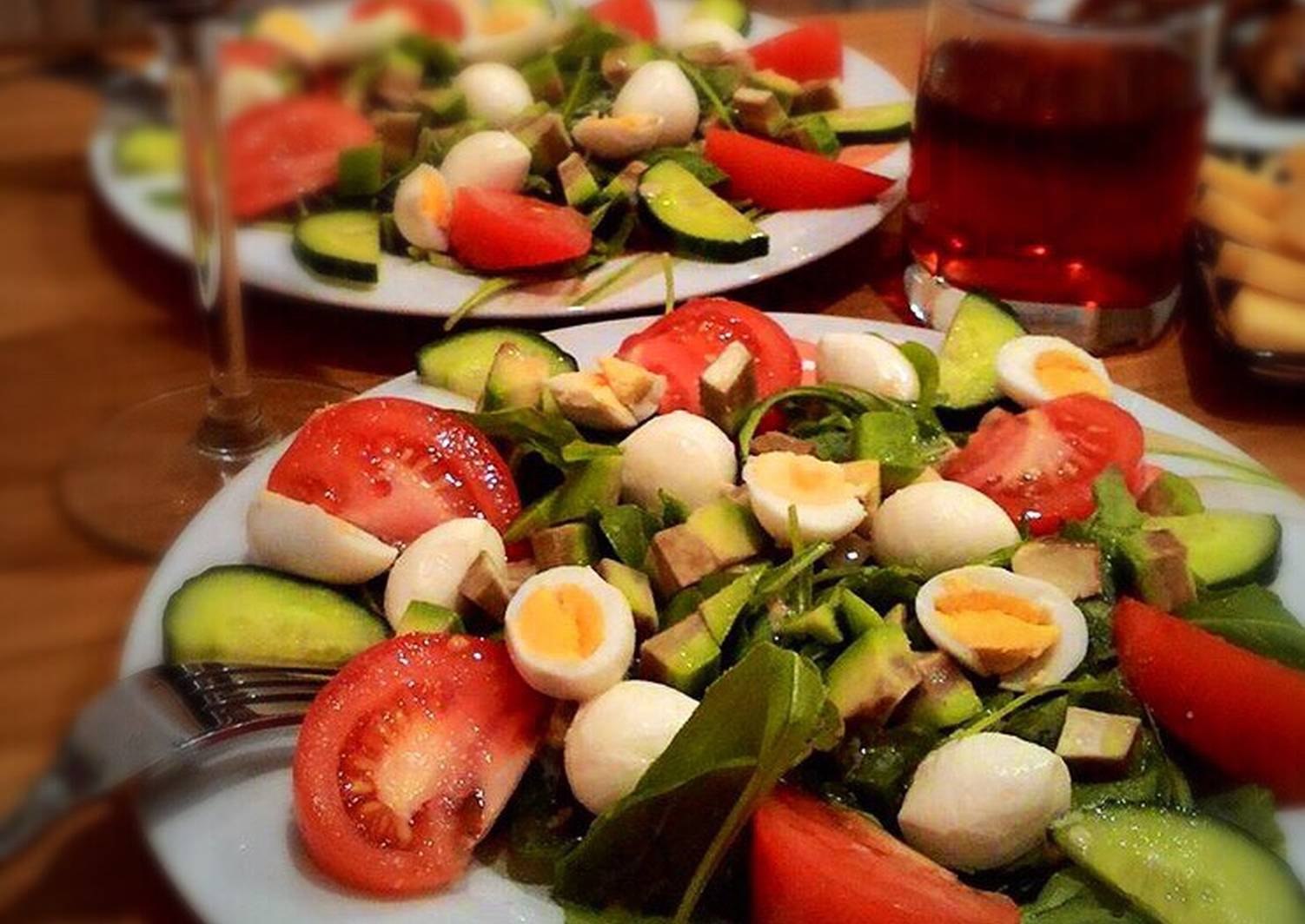 Салат с перепелиными яйцами и помидорами черри и моцареллой