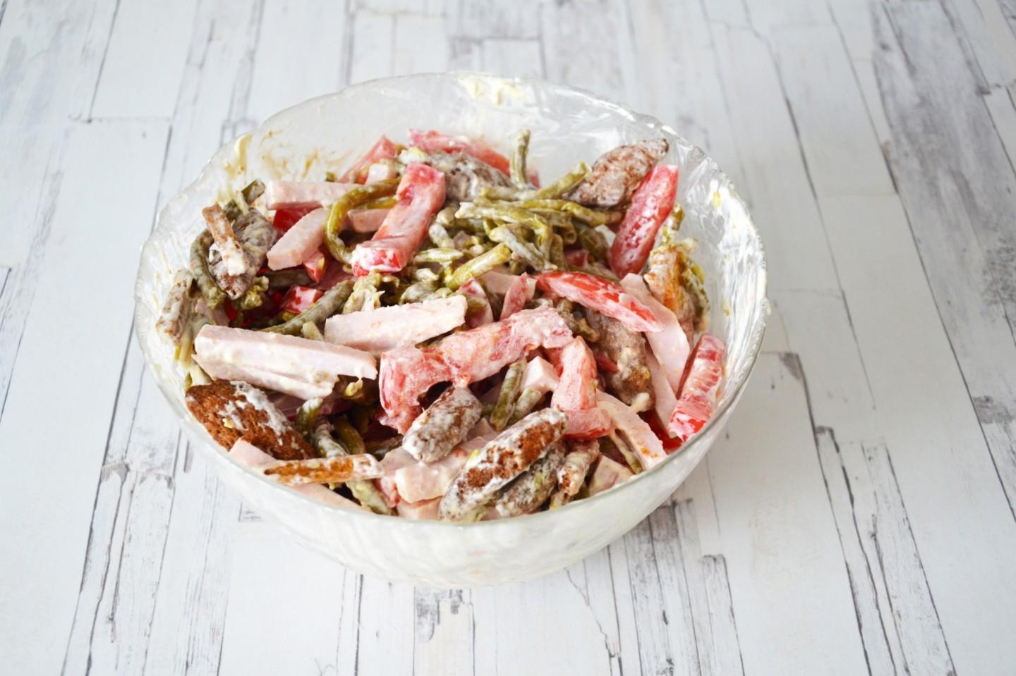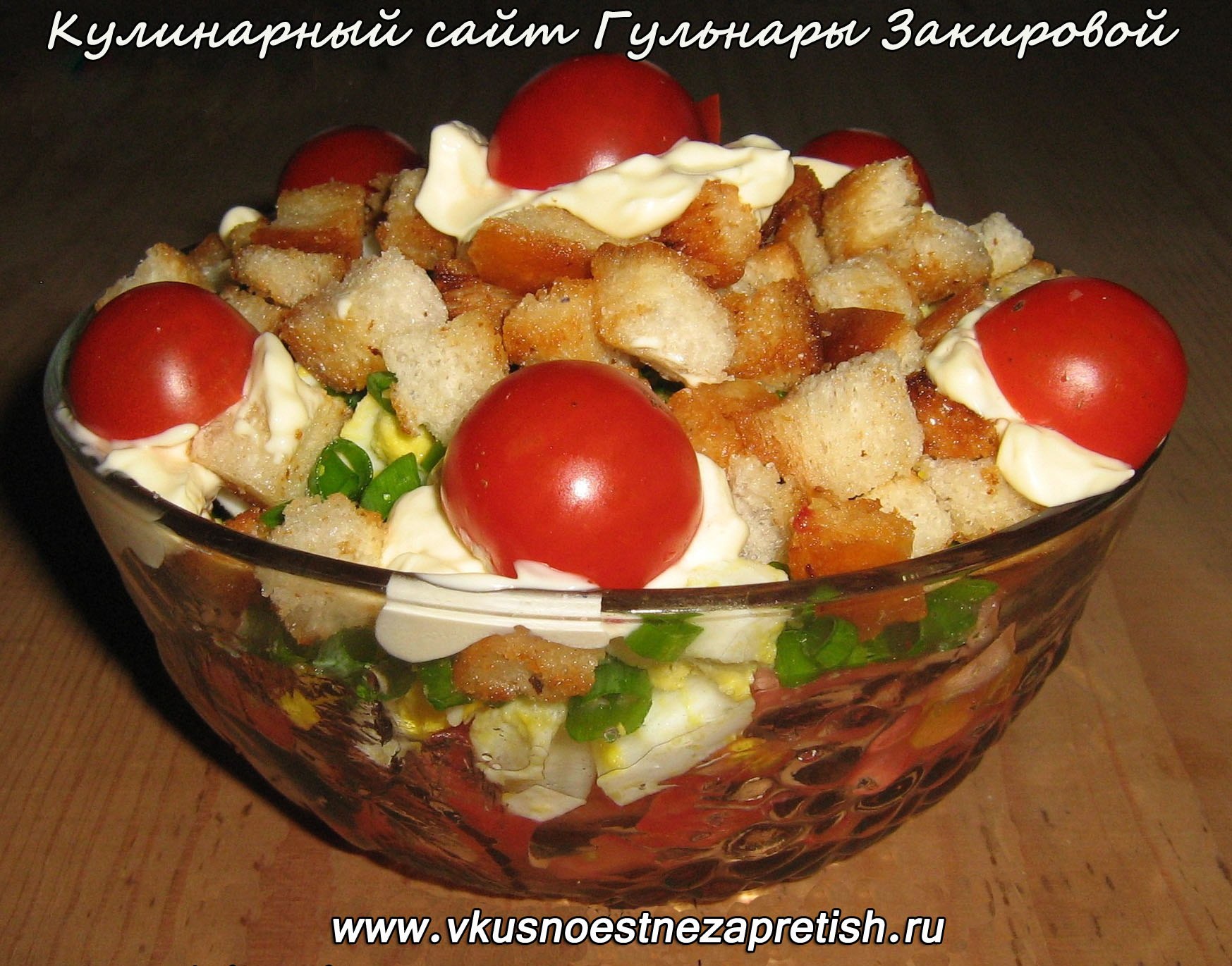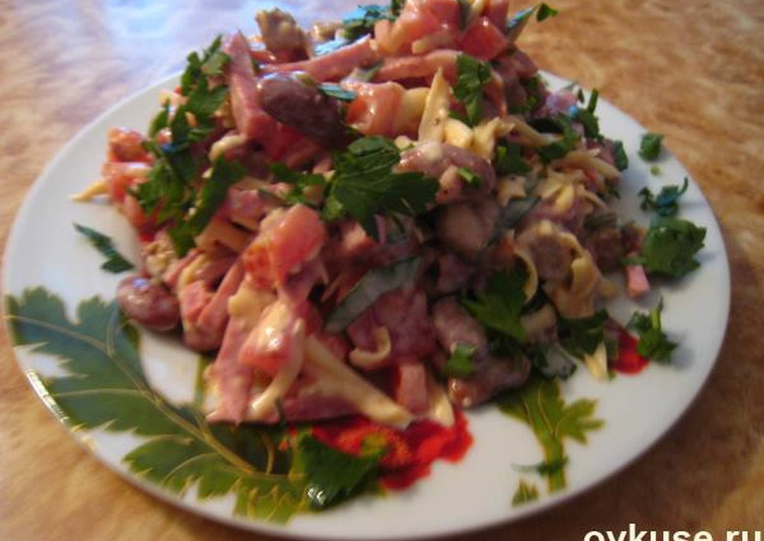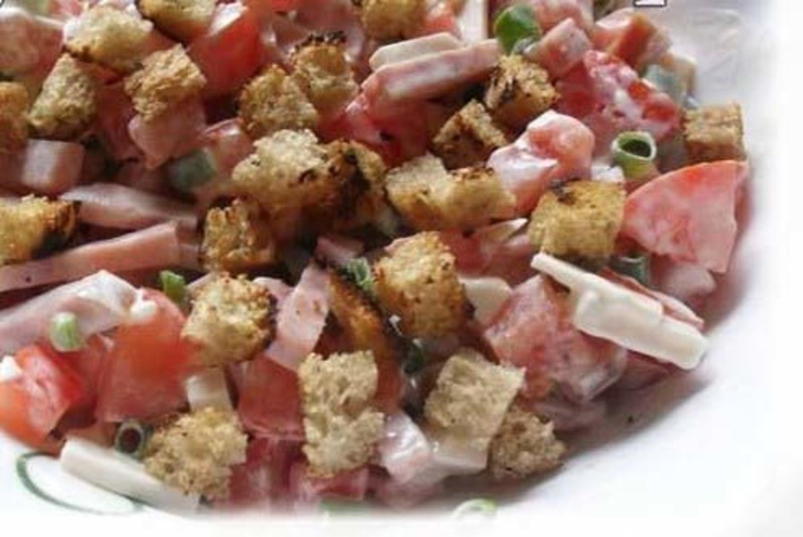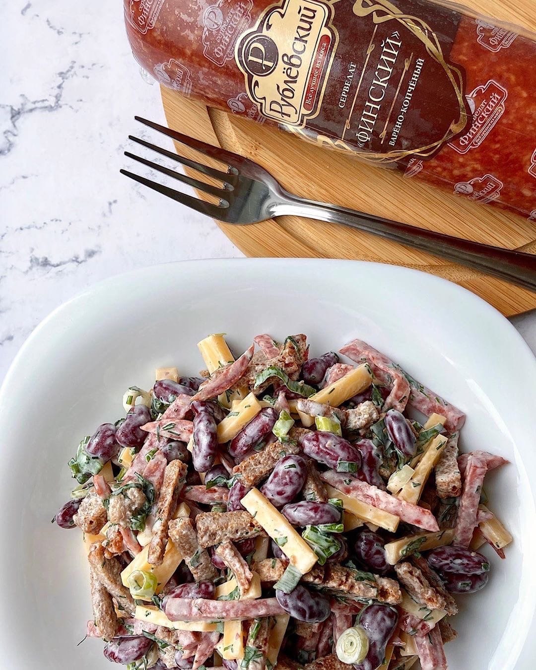 Салат с сухариками и фасолью и копченой колбасой помидорами
