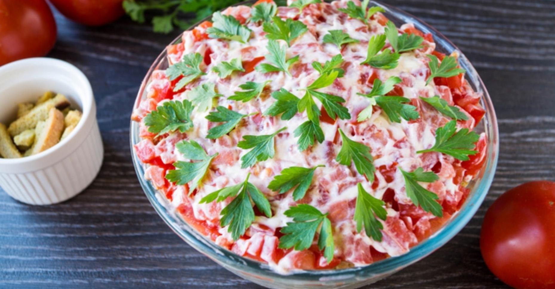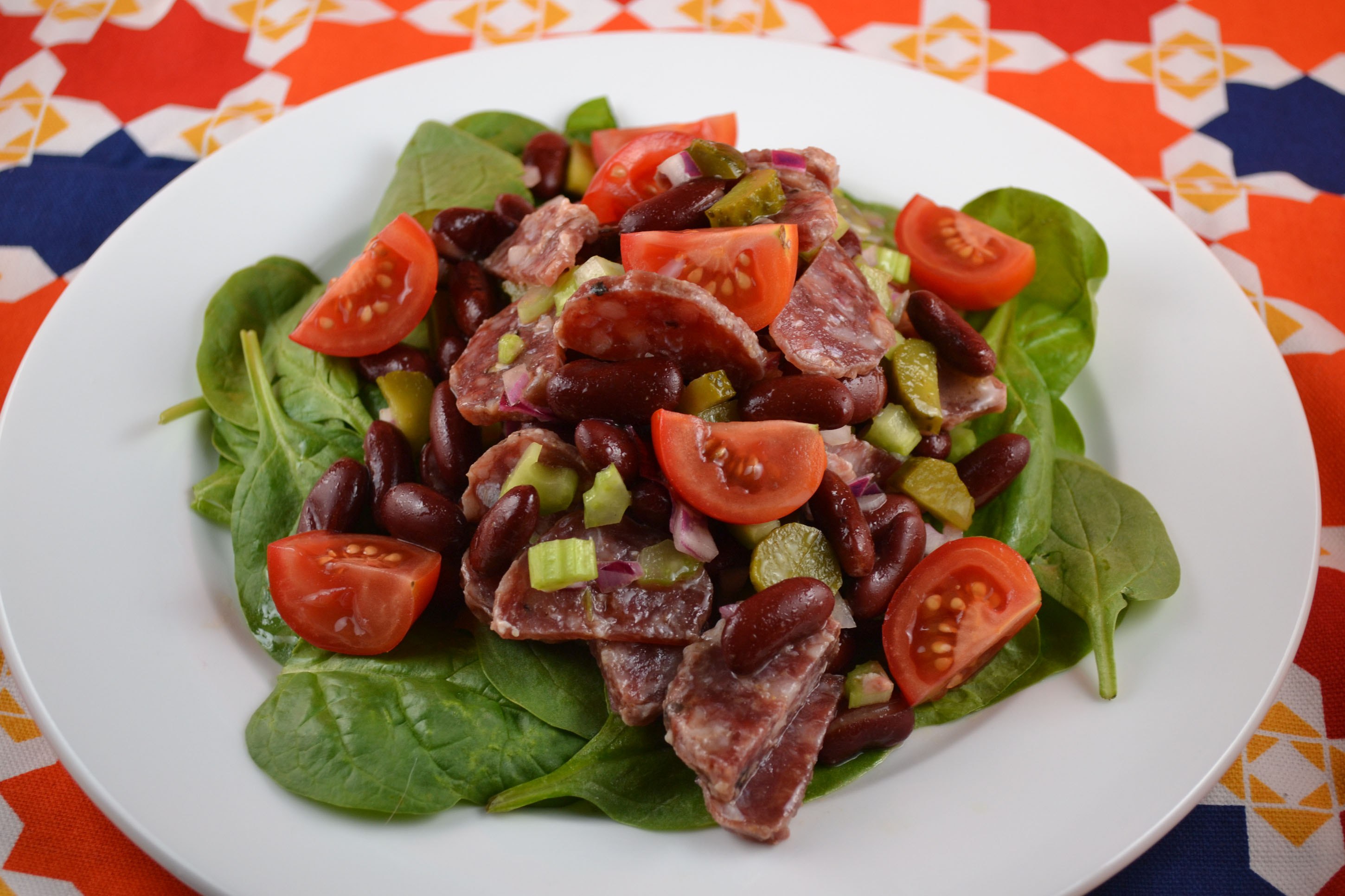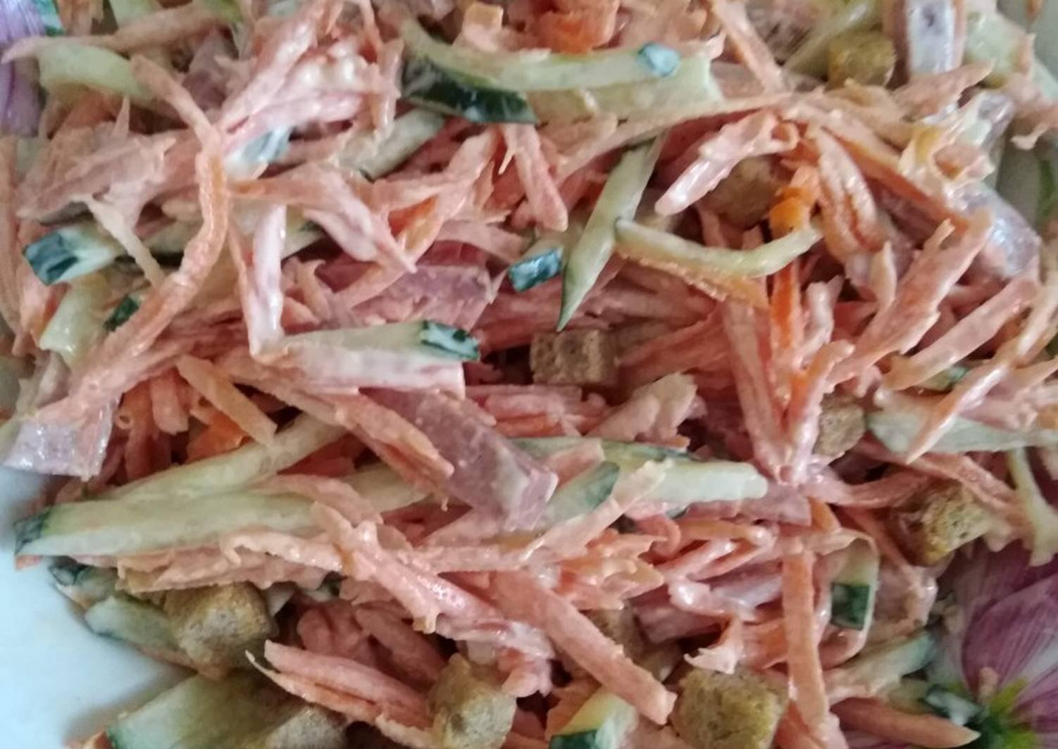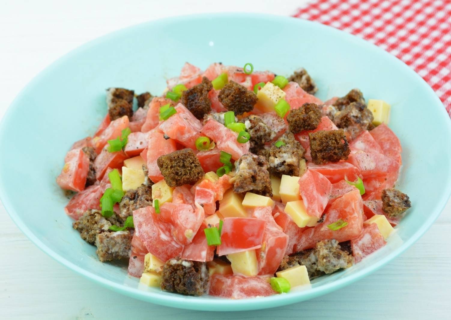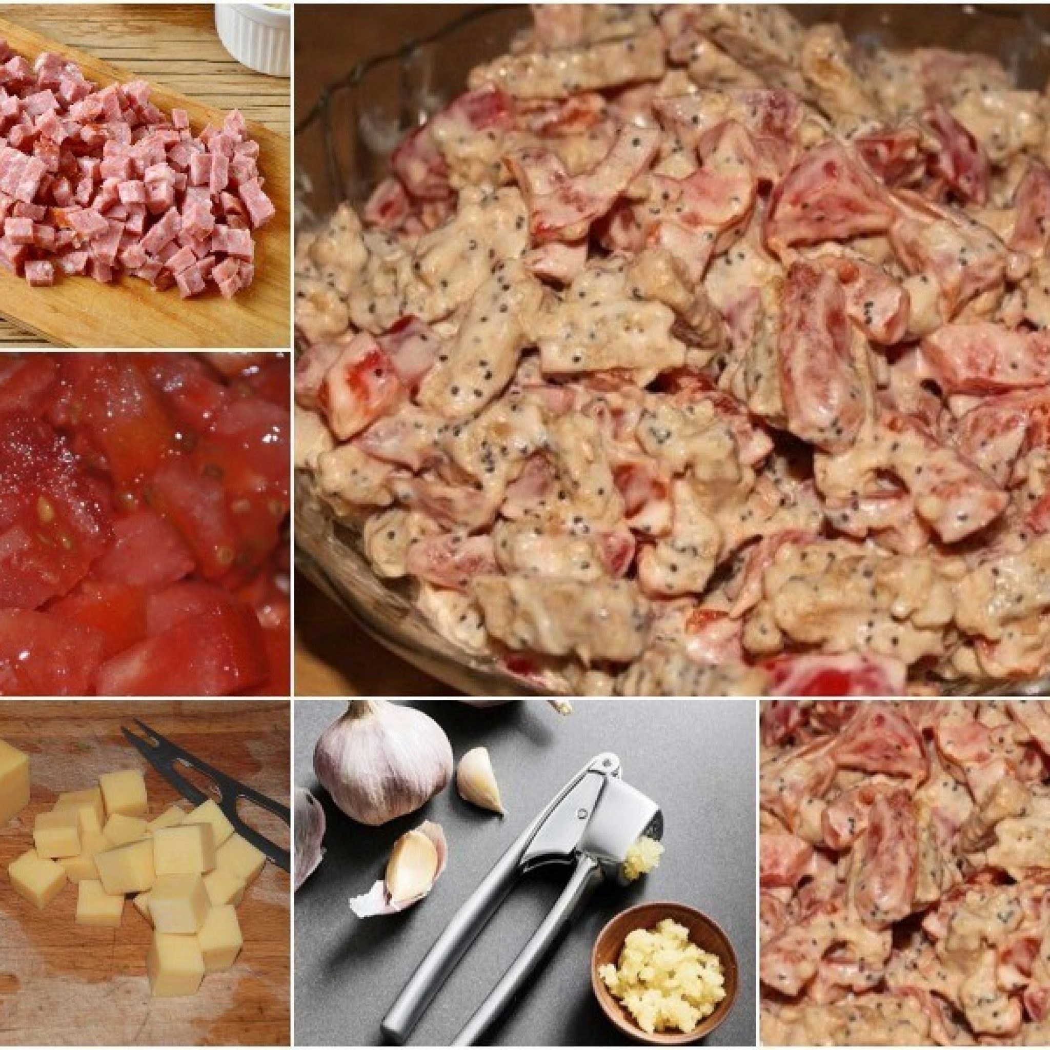 Салат с сухариками и фасолью и копченой колбасой помидорами