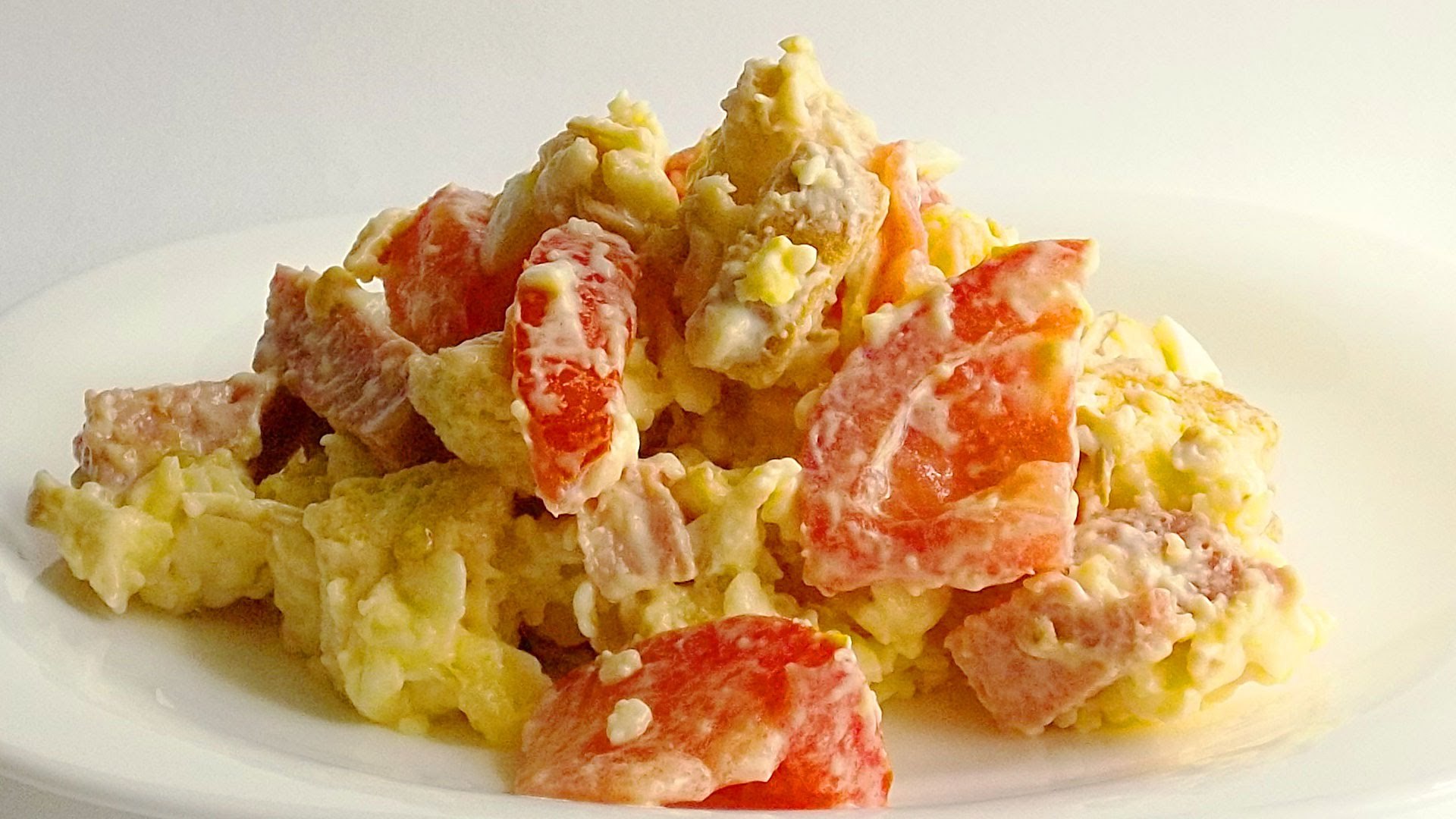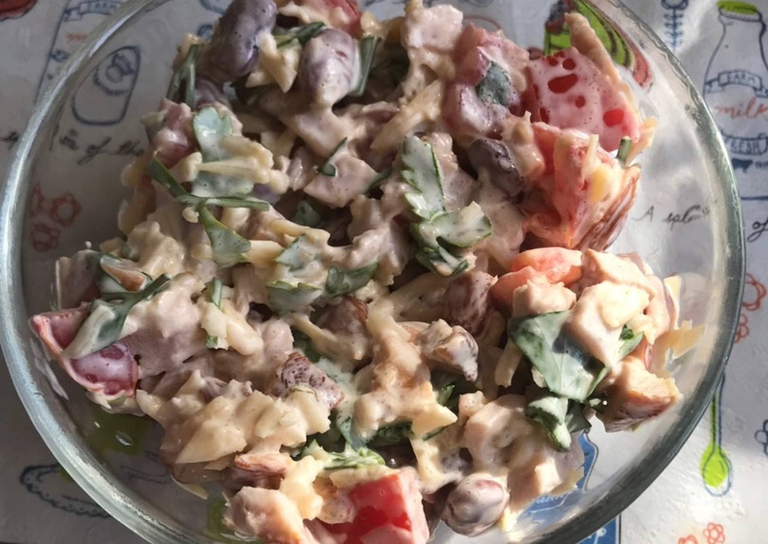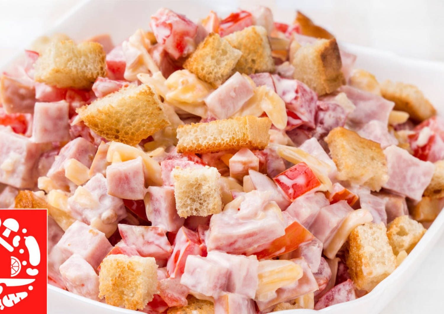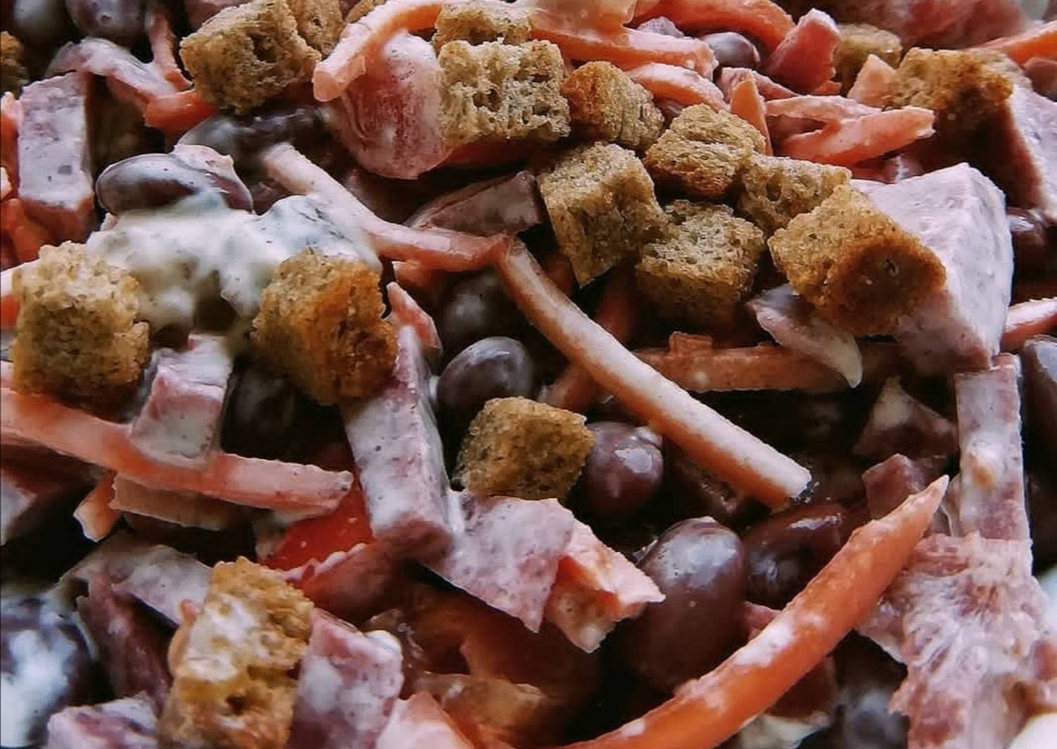 Салат с фасолью и сухариками и ветчиной и помидорами