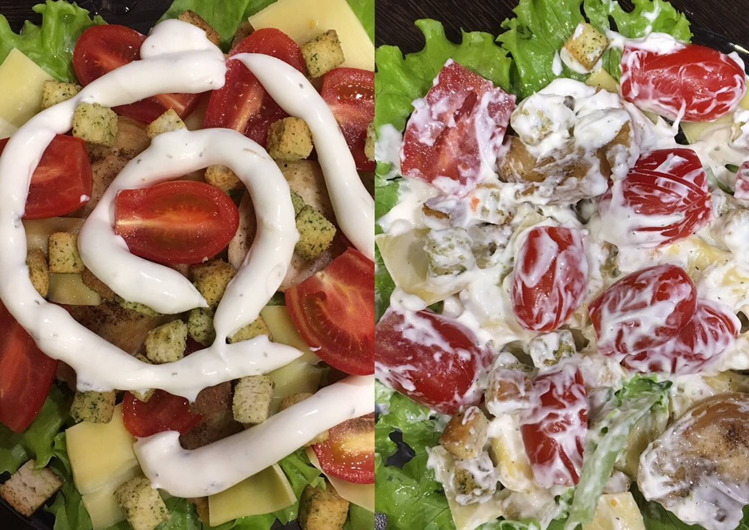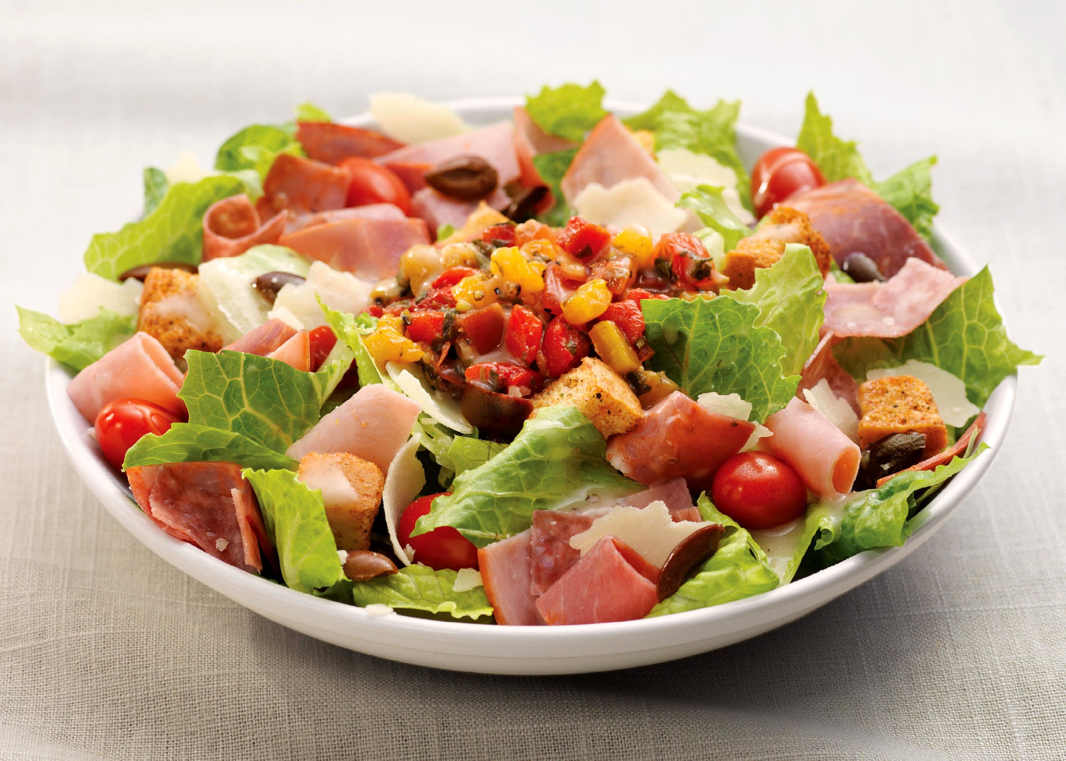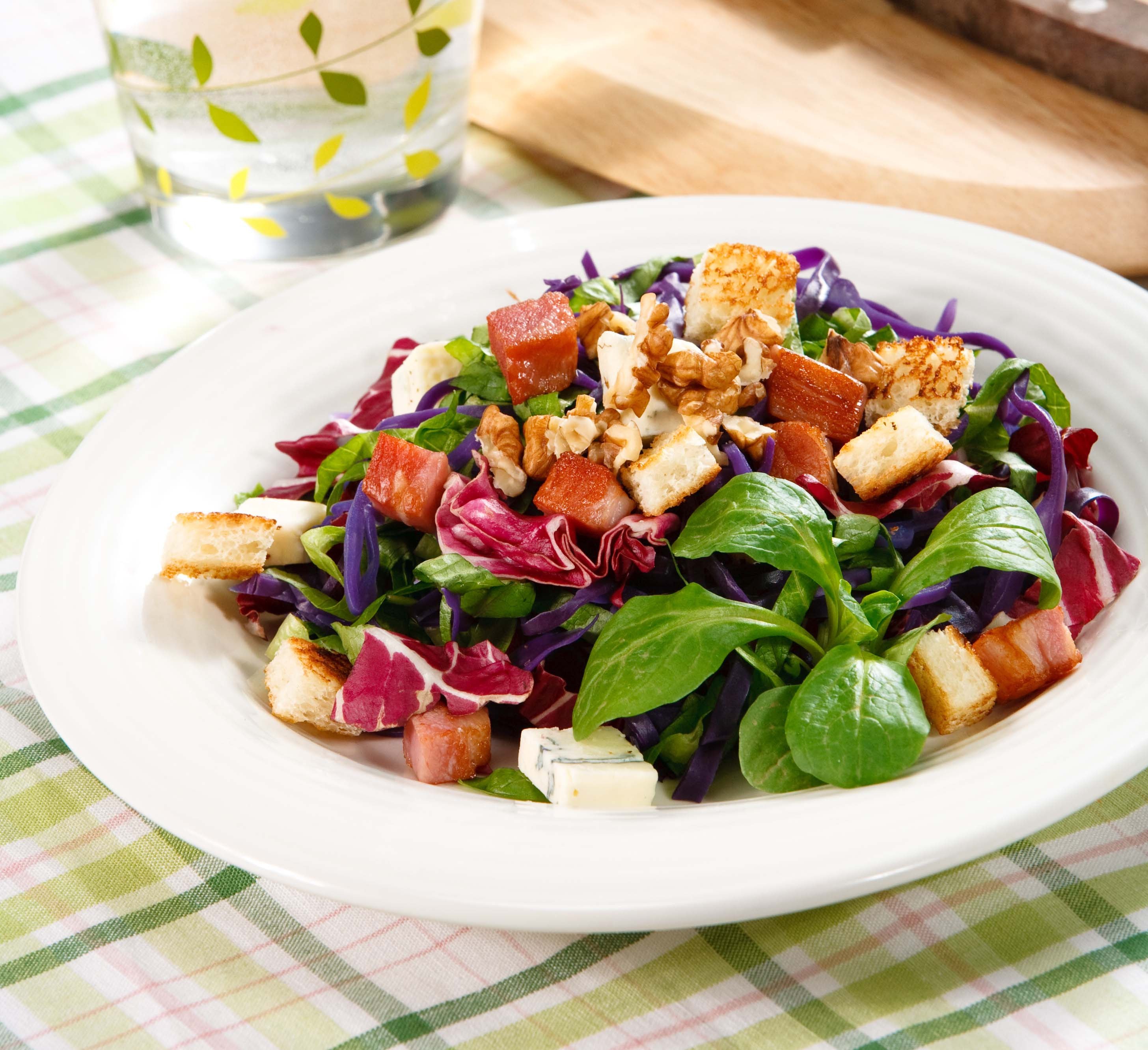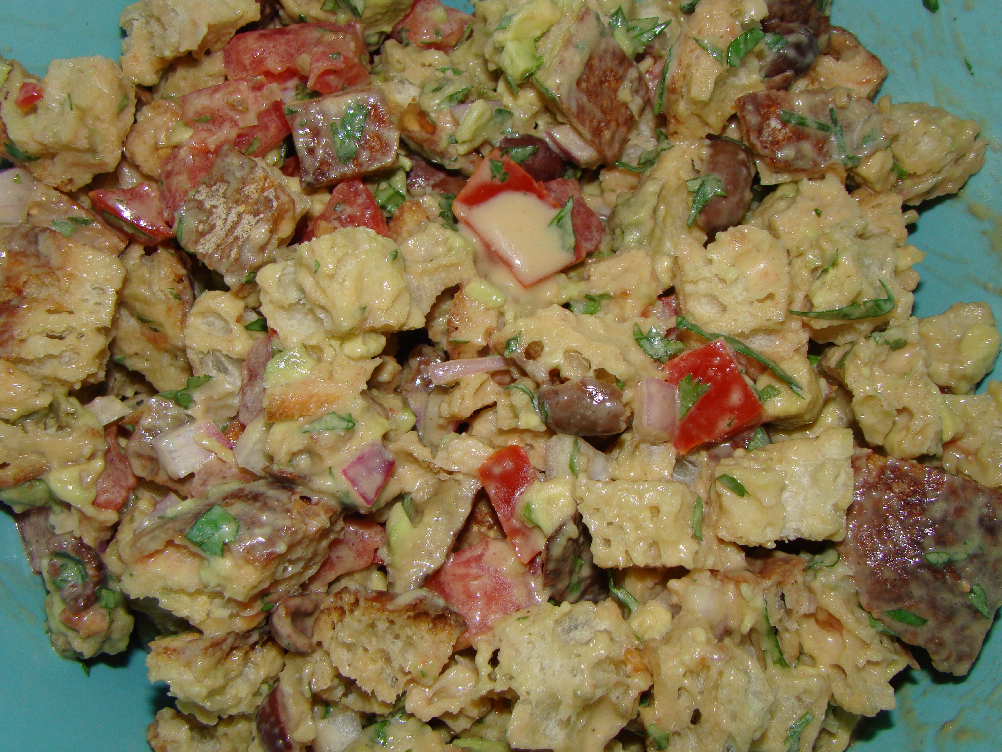 Салат с фасолью и сухариками и ветчиной и помидорами